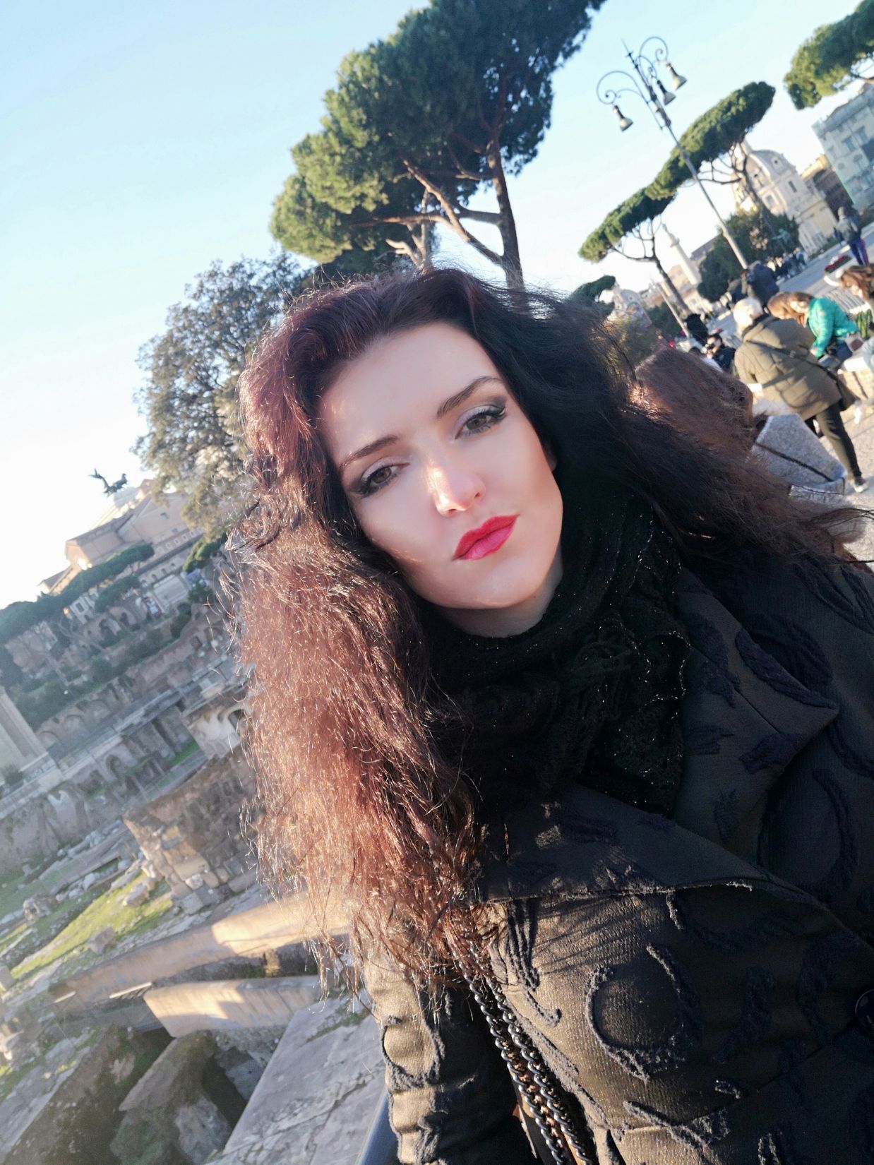 Na potulkách zimným Rímom sú moje vlasy jemne vyrovnané aj vlnité súčasne, upustené od večnej divokej hrivy, zvolený dievčensko-ženský look je v harmónii rytmu s chladným vánkom. Zimné chladné odtiene sú zvolené tiež pre očný make-up od značky Sephora, tmavý vo vonkajškom kútiku oka a svetlý značky Dior cez celé viečko. Dotyk rumenca na lícach vyčarila značka Bourjois, špirála Gosh a rúž Oriflame the One odtieň red ovation, môj obľúbený dotvorili tento look.