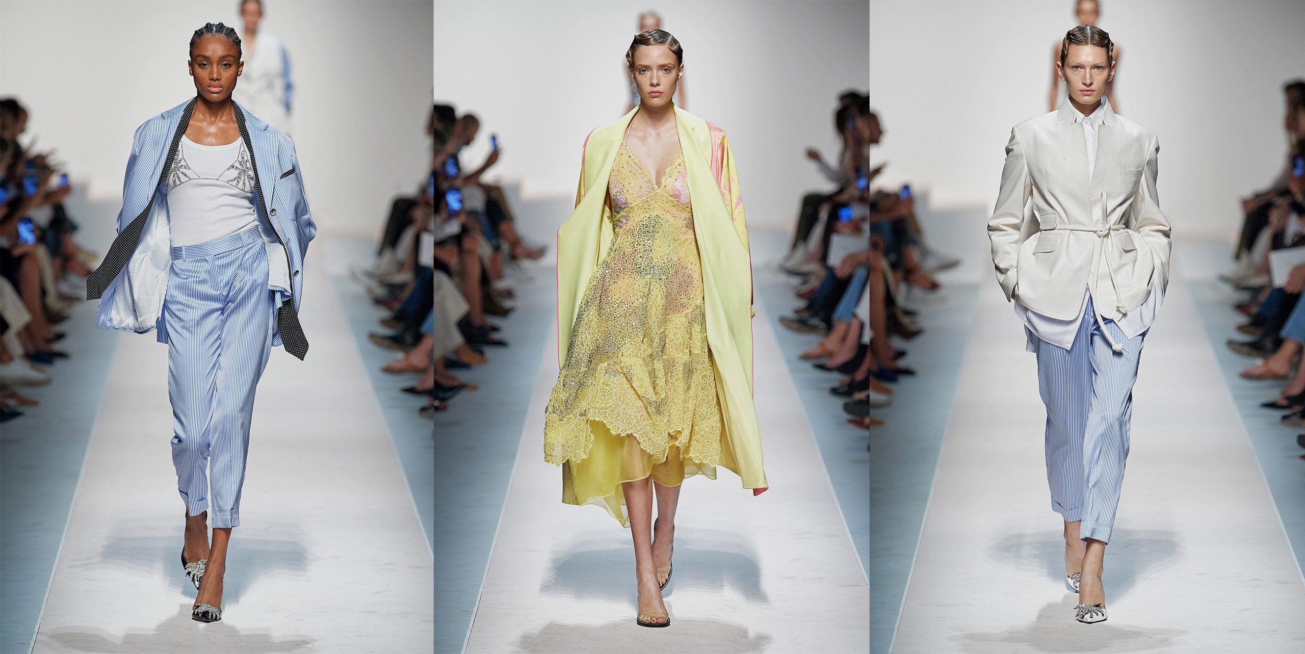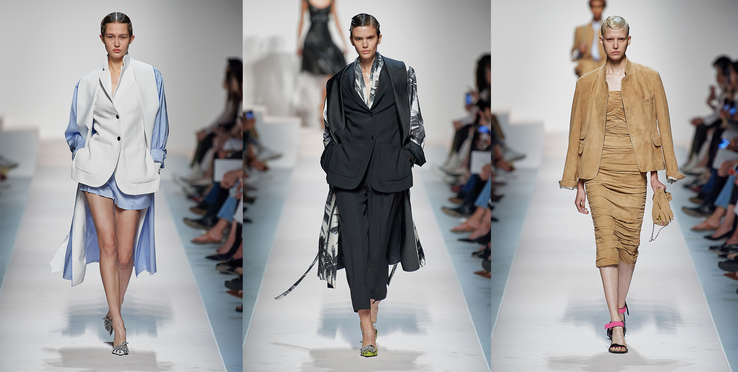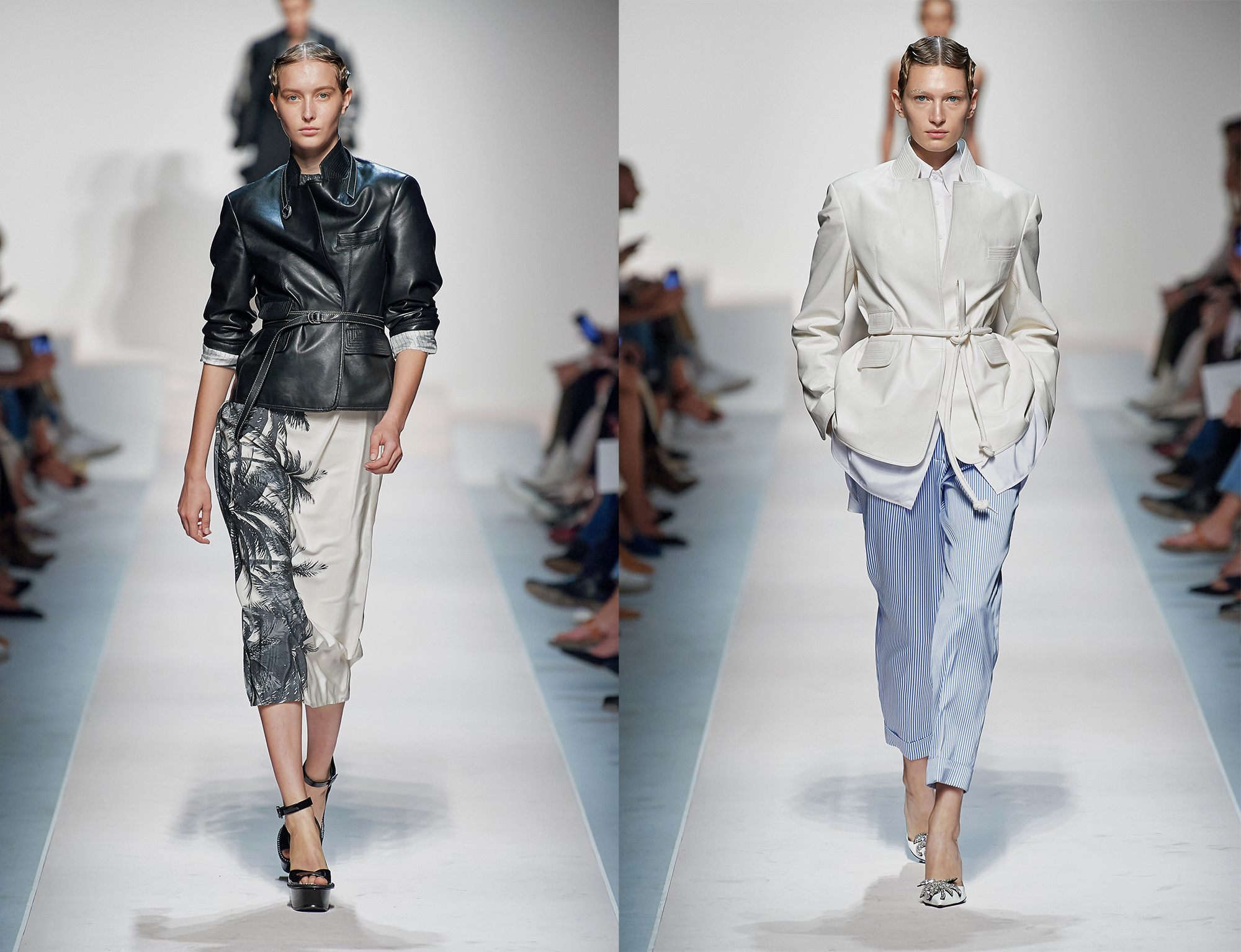 Krajčírske kontrasty vytvorili moderný ženský šatník. Prehliadka letnej kolekcie Jar/Leto 2020 sa konala počas Milan Fashion Weeku v prehliadkovom týždni Móda Ženy, 21. septembra 2019.