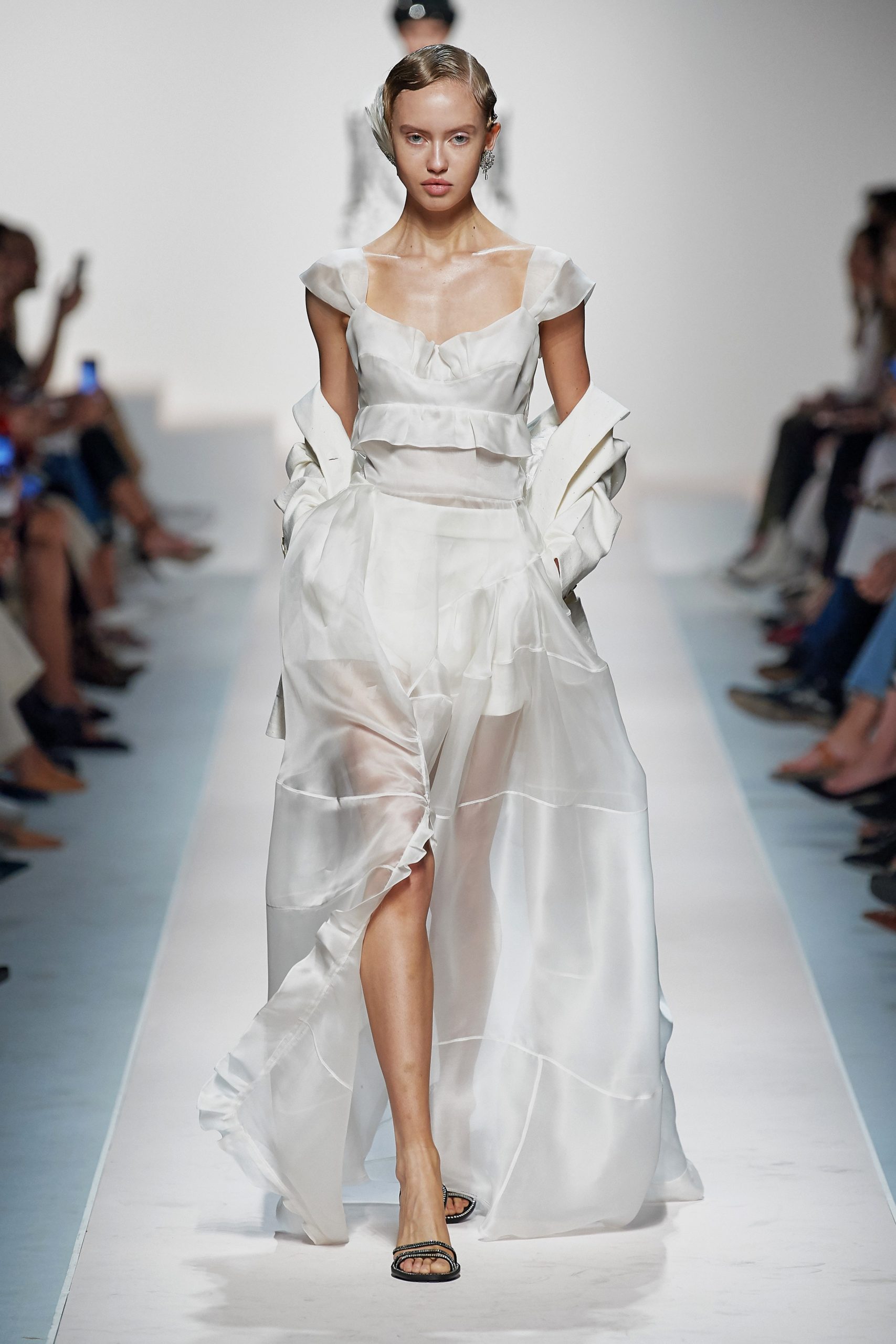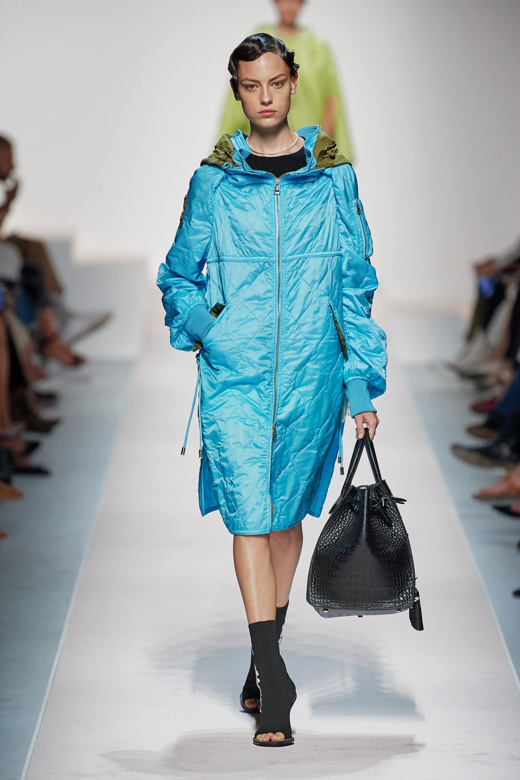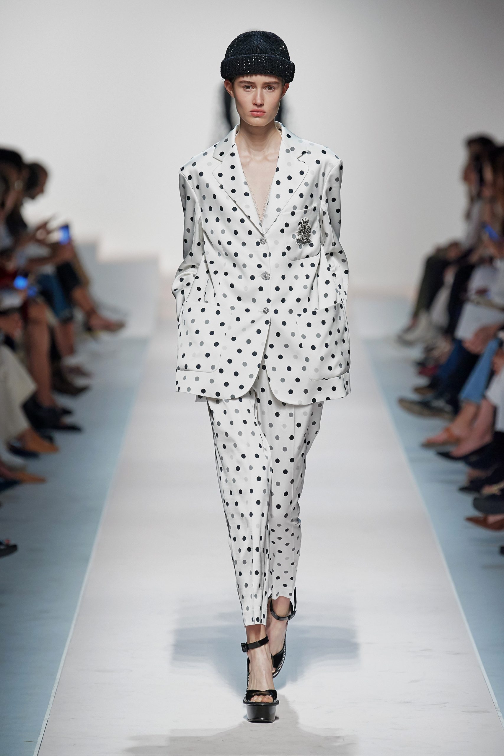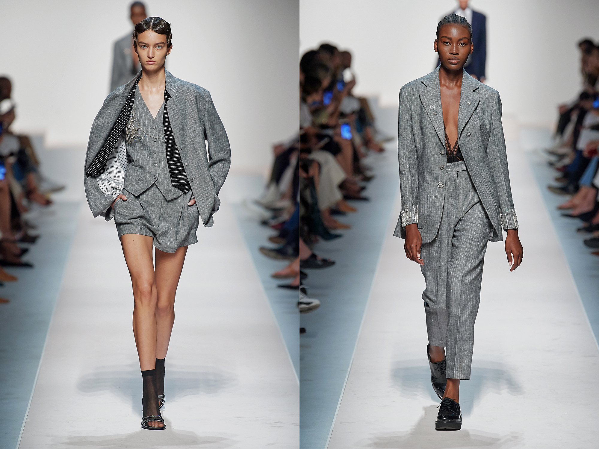 Krajčírske kontrasty vytvorili moderný ženský šatník. Prehliadka letnej kolekcie Jar/Leto 2020 sa konala počas Milan Fashion Weeku v prehliadkovom týždni Móda Ženy, 21. septembra 2019.