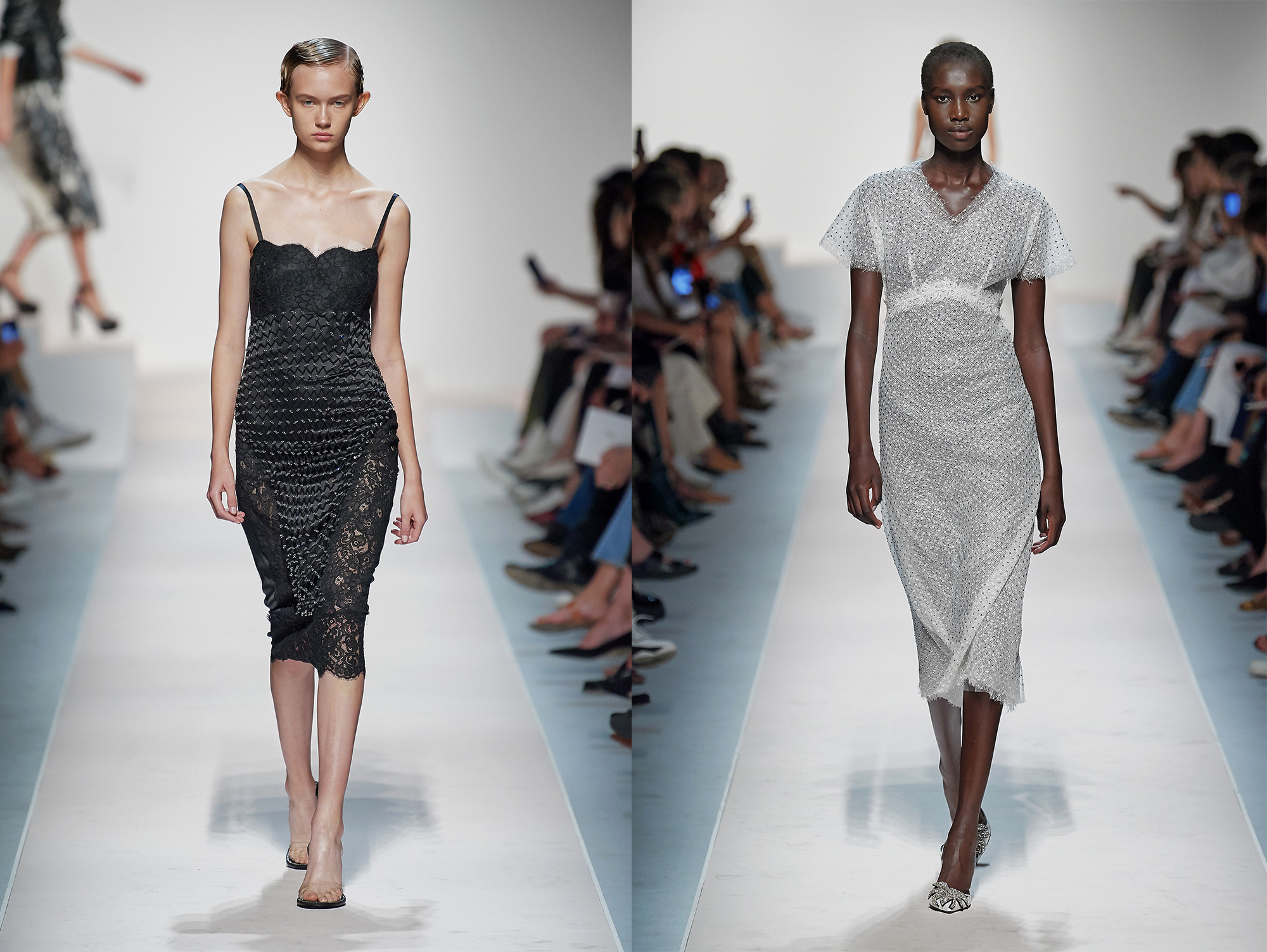 Organza a skladaná čipka zvýšili zmyselnosť večerných odevov pohrávajúc sa pritom s transparentnosťou.
