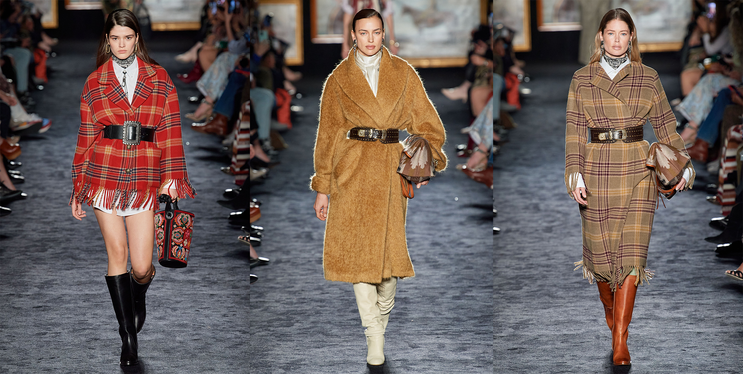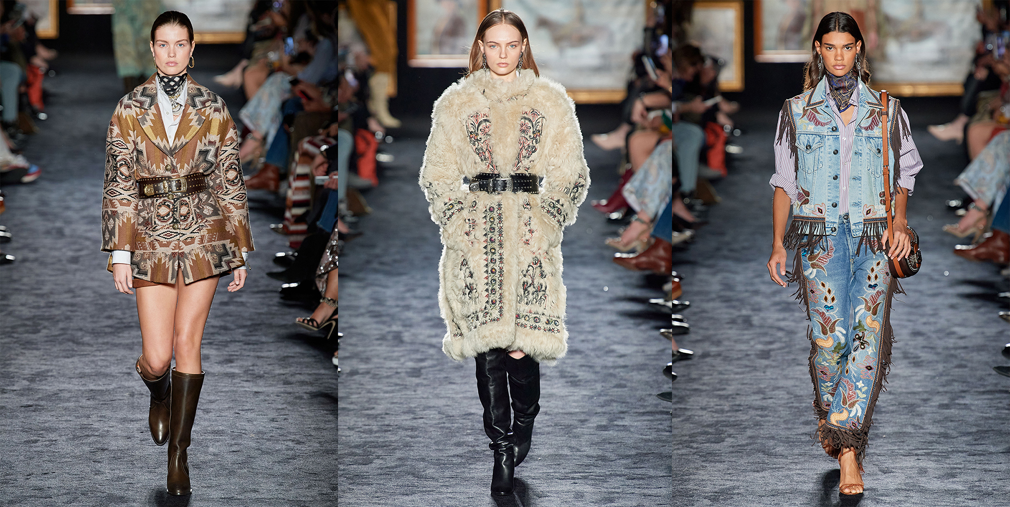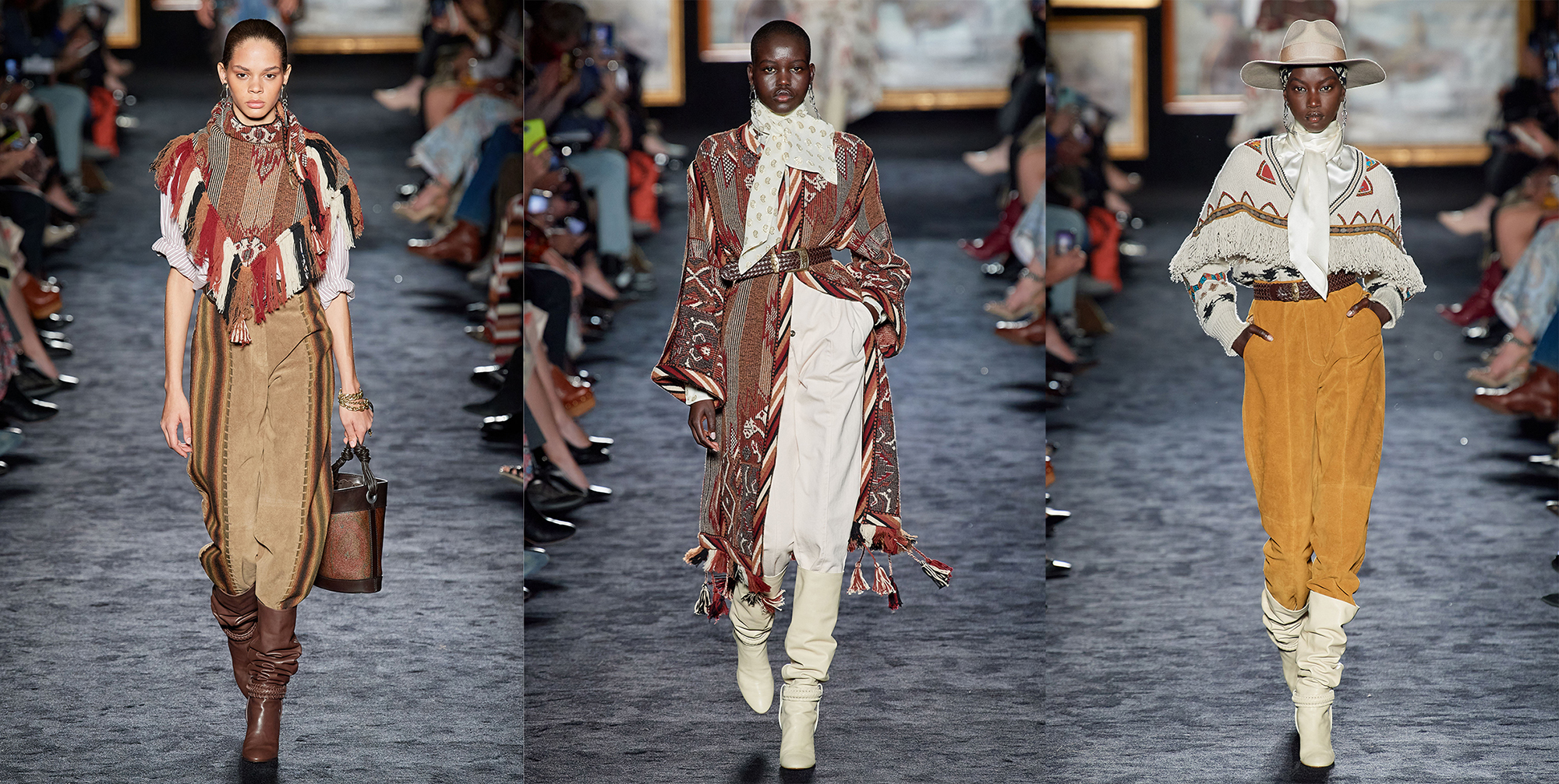 Dizajnérka Veronika Etro sa pre sezónu Jeseň / Zima 2020 – 21 vydala folkovými medzipristátiami, ktoré zahŕňali krátke strapcové a tkané dekové pončá prehodené skrz jazdecké nohavice a dva typy topánok.