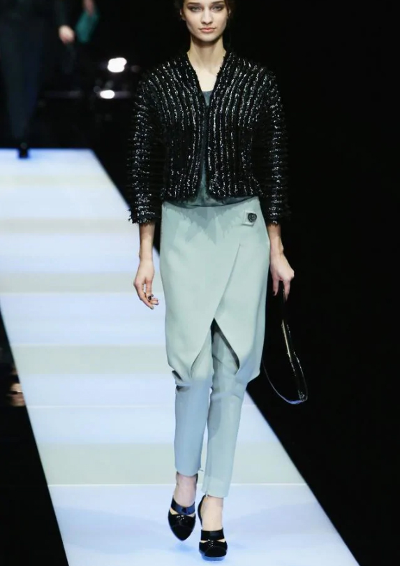 Miestami mi napadlo porovnanie pri zhliadnutí modelov nohavíc so sukňovým pásom taká paralela v mysli na novinku od kráľa módy Giorgio Armani z roku 2015, kedy uzavrel týždeň módy v Miláne hybridným typom sukňových nohavíc. Spredu vyzerala sukňa podobne ako separátna časť na nohaviciach v kolekcii u Kateřiny, ale vzadu bola šikovným strihom spojená s nohavicami. Prikladám fotografiu z kolekcie jeseň/zima 2015 Giorgio Armani len na oživenie, na margo ako zaujímavý fakt.