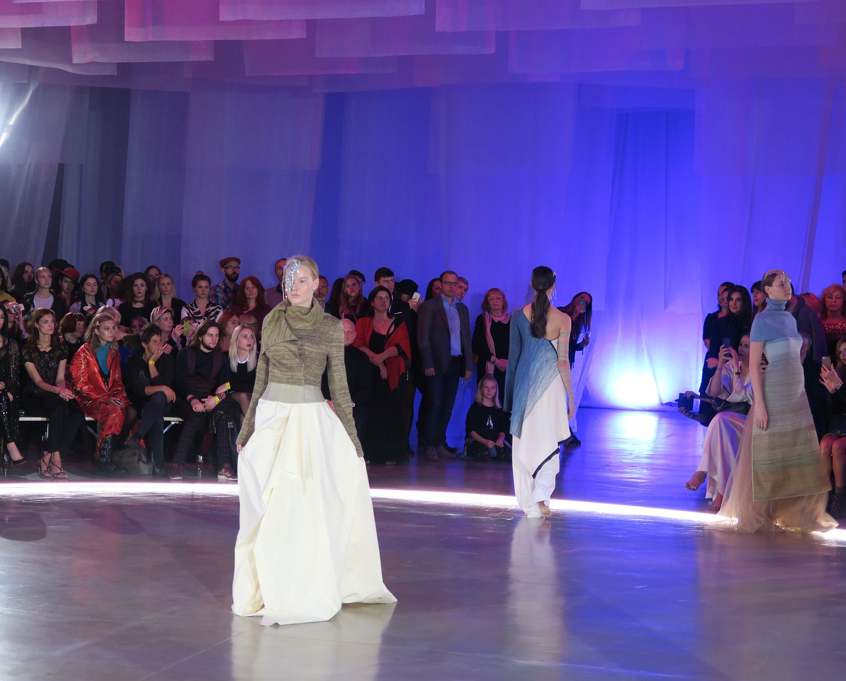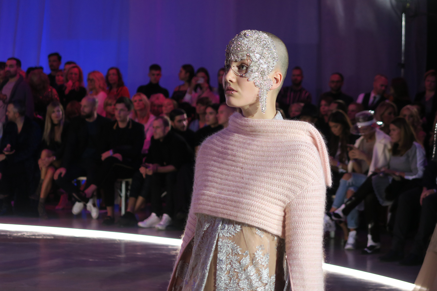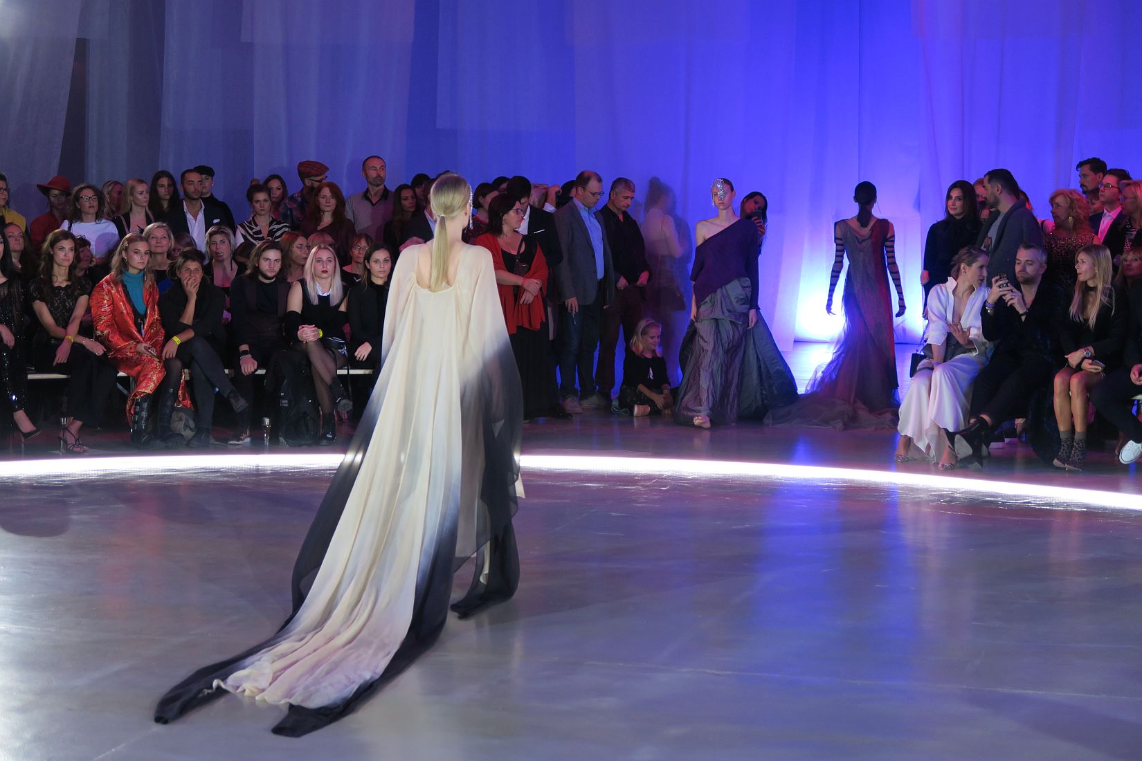 Vďaka výbornému osvetleniu na tomto módnom podujatí, z ktorého som bola nadšená, sa mi podarilo zachytiť takýto záber z uchvacujúcej módnej prehliadky Borisa Hanečku a Dany Vody. Modelky boli prekrásne nastylované, šperková maska a zdobenie na hlavách krásne korešpondovala so šatami a jemnosťou a nežnou farebnosťou pleteniny. Zo zadu je model tiež nádherný – viac fotografií si môžete pozrieť v albume Fashion LIVE – september 2018 na facebook stránke Mya Mirell Fashionista.