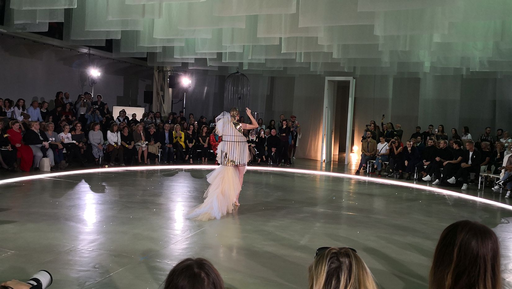 a záverečná klietka na hlave modelky Denisi Dvončovej, ktorá ju držala iba jednou rukou a pomáhala si pritom zubami okusujúc bydlo ako roubík. Obdivuhodný výkon modelky, musím uznať, dúfajme, že klietka nebola príliš ťažká a zuby jej ostali. Aj keď aj šaty s nadstaveným dáždničkom, aj klietku som už tiež niekde videla.