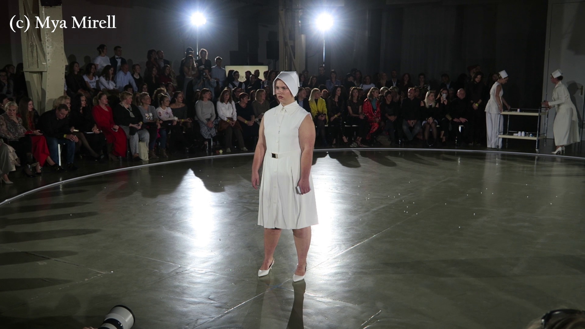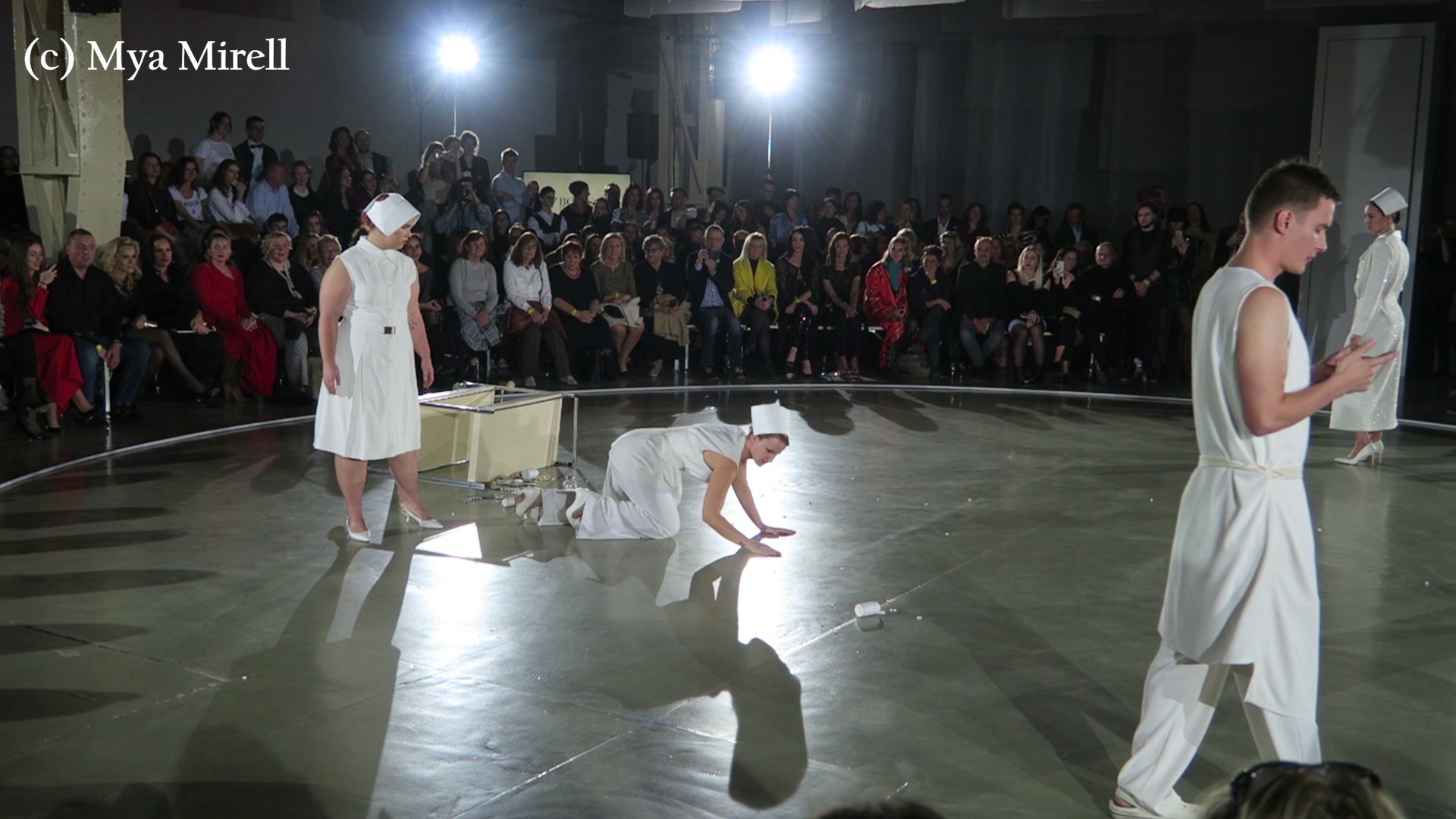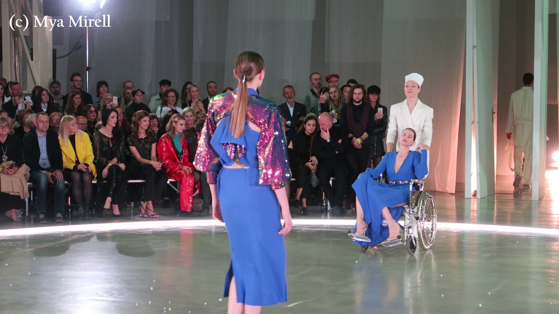 Ďalšie šokujúce a do deja zapadajúce prvky tvorili doplnkové kulisy ako zlatý invalidný vozíček na móle, na ktorom sestrička tlačila modelku ,