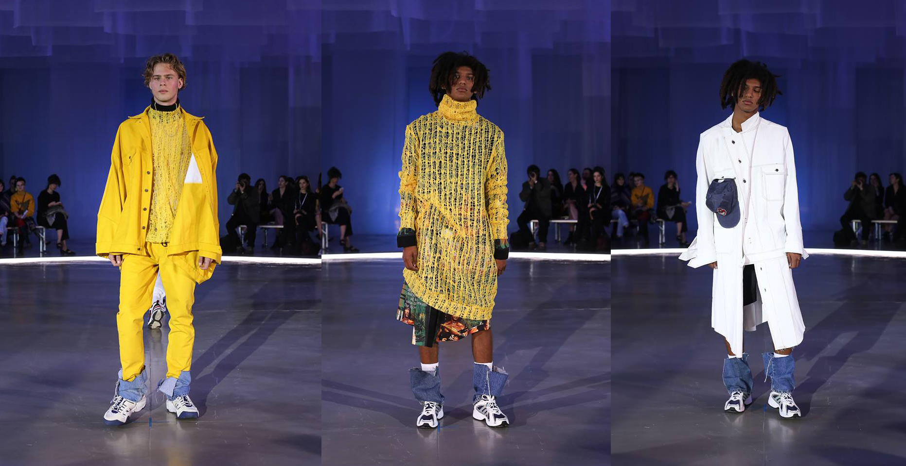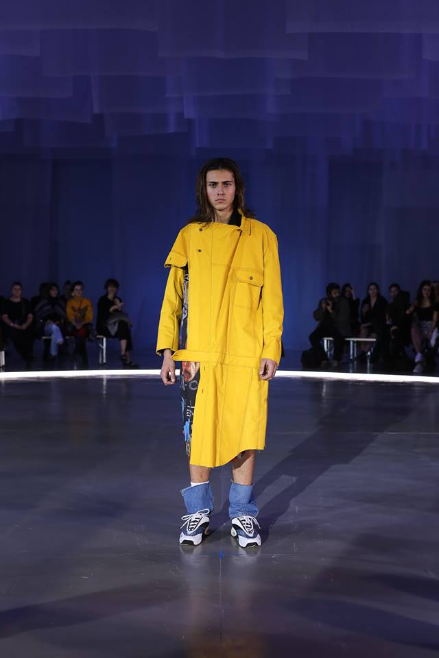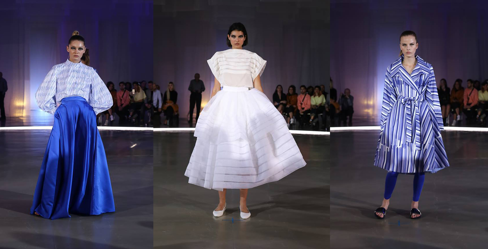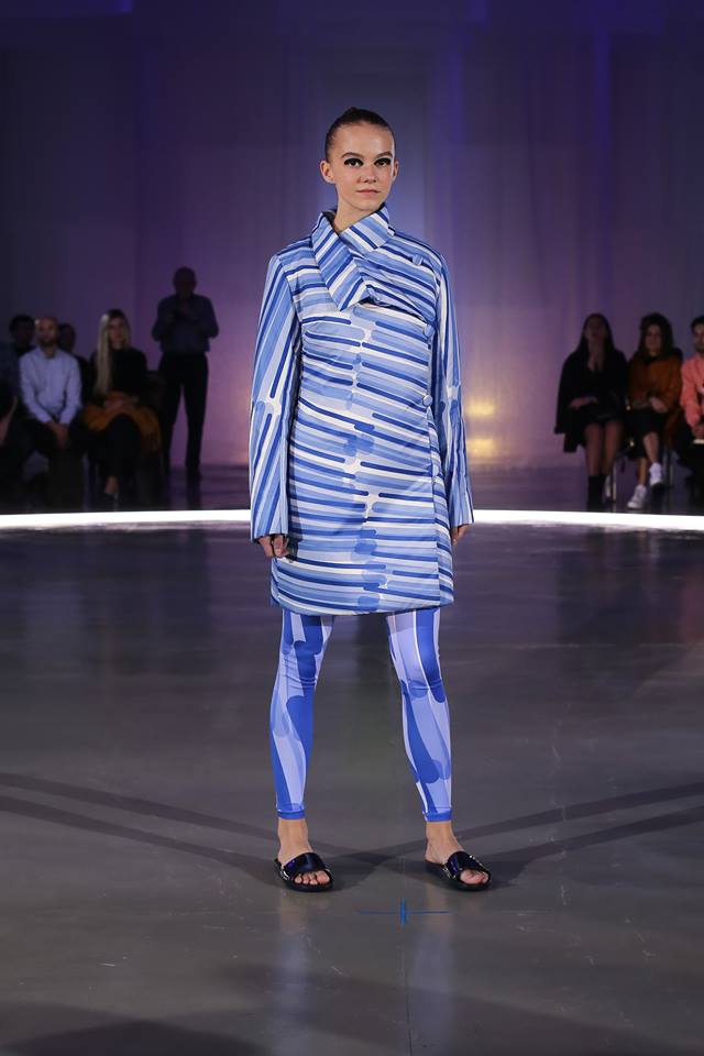 Návrhárka sa zamerala na krajčírske detaily. Kolekciu nazvala MONOCHROMA – predstavila modely, ktoré nehýrili všetkými farbami ako v predošlej kolekcii, ale boli tentokrát jemnejšie, sofistikovanejšie a monochromaticky ladené do jednej farebnej tóniny vrámci jedného outfitu. Žltá je moja najobľúbenejšia farba a tak som oči nechala na tomto modeli. Zaujímavá je vrchrná topová časť, kde horizontálne vrstvené línie korešpondujú s farebnými pásikmi na ostatných modeloch.