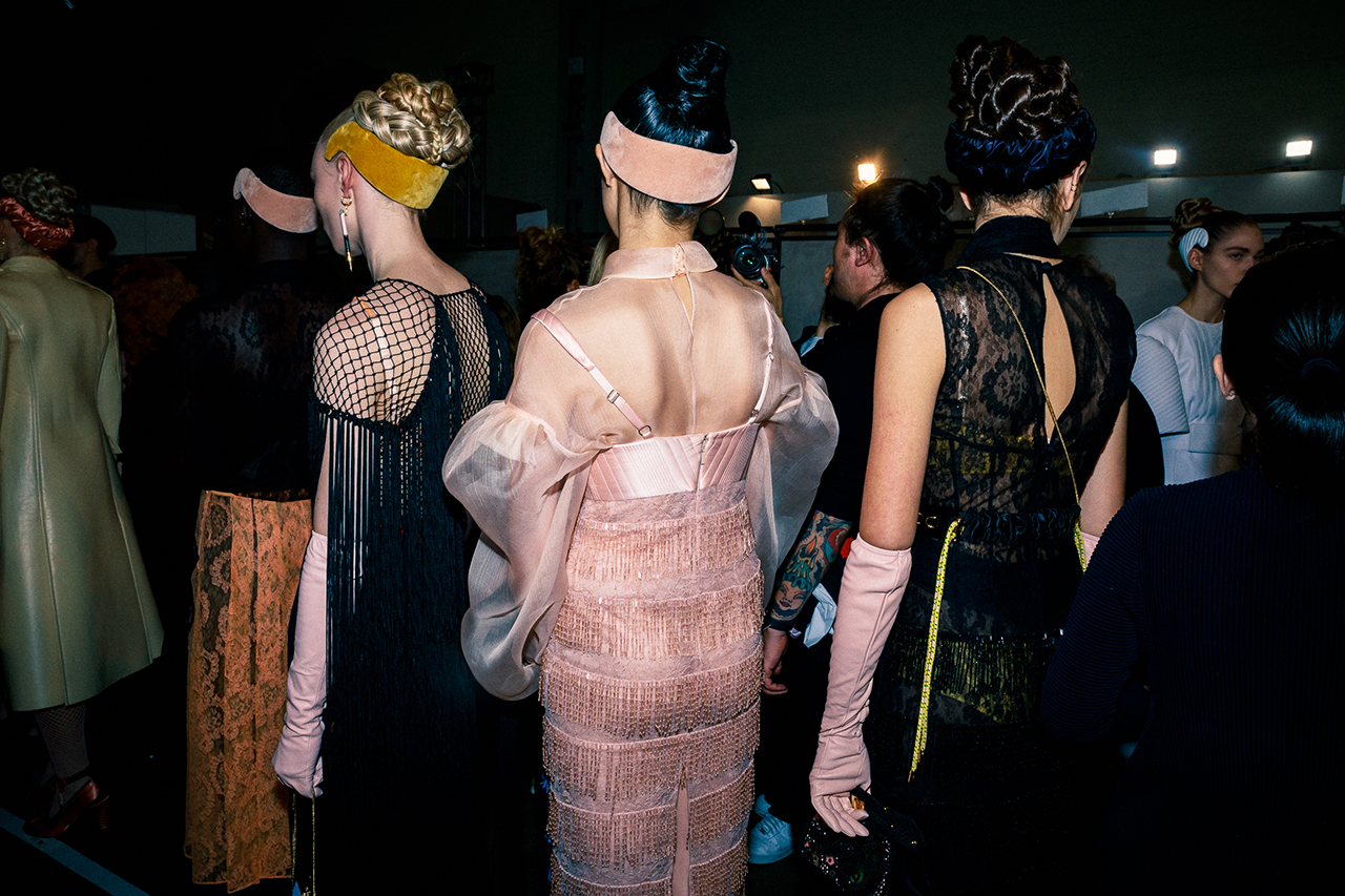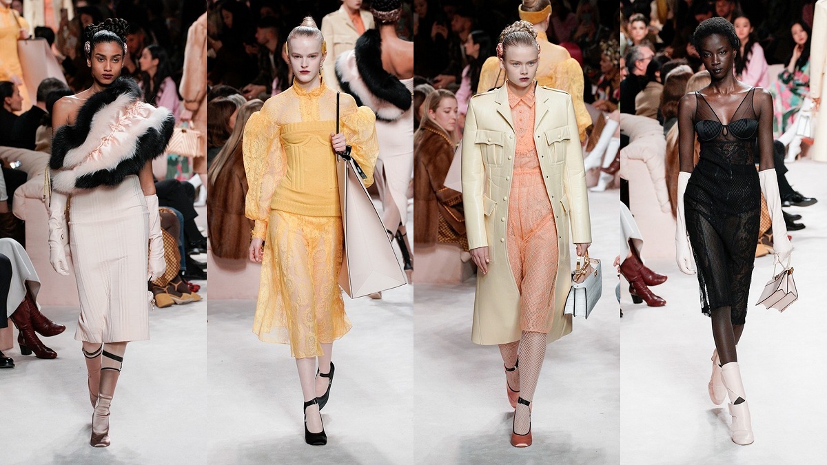 Na večer predstavila značka Fendi viac odhaľujúce lingerie looky , saténové bustier, korzetové poprsnejšie detaily s lemovaním a čipkou, oblečené s lodičkami a podväzkovými členkovými popruhami a čelenkami.