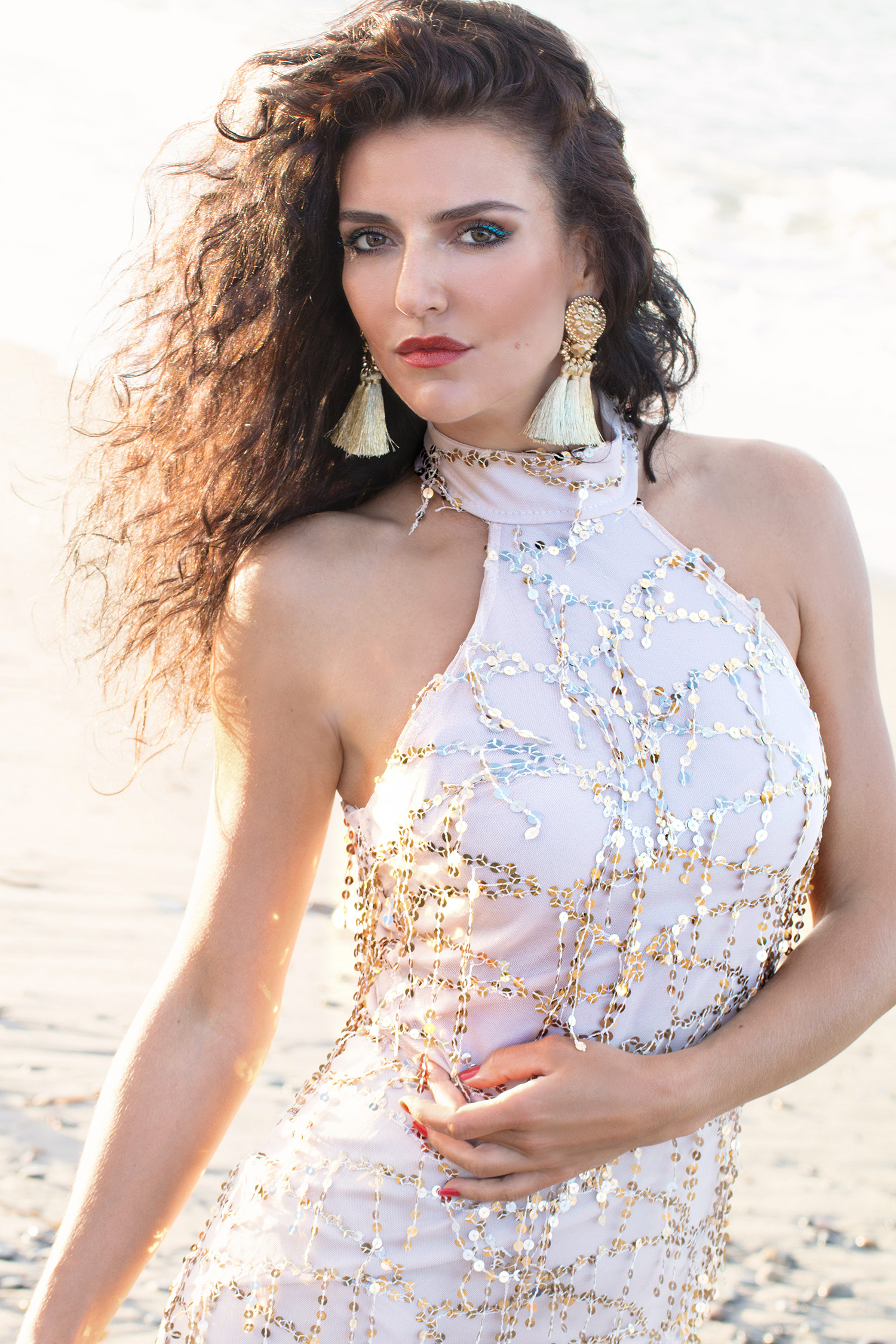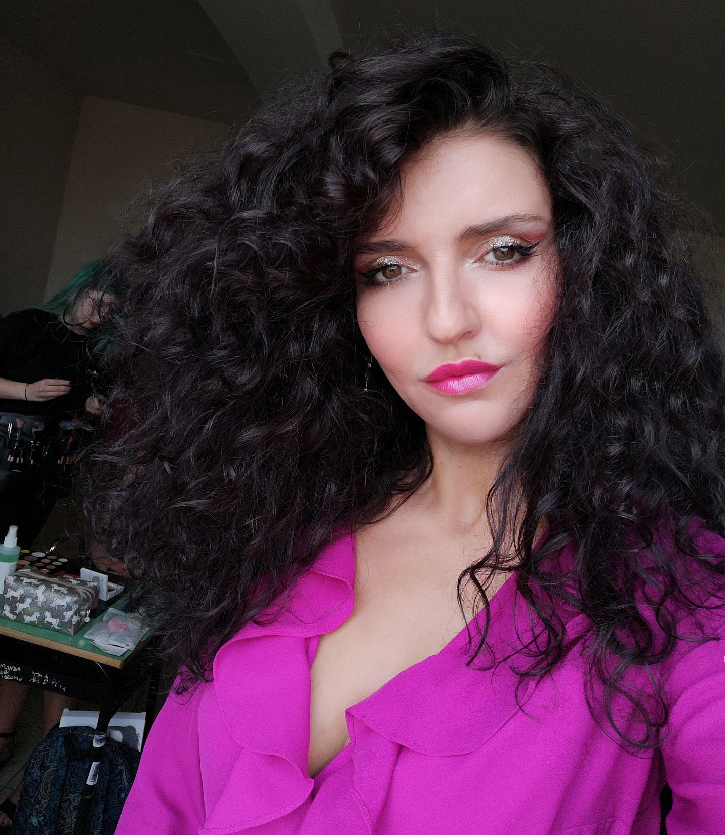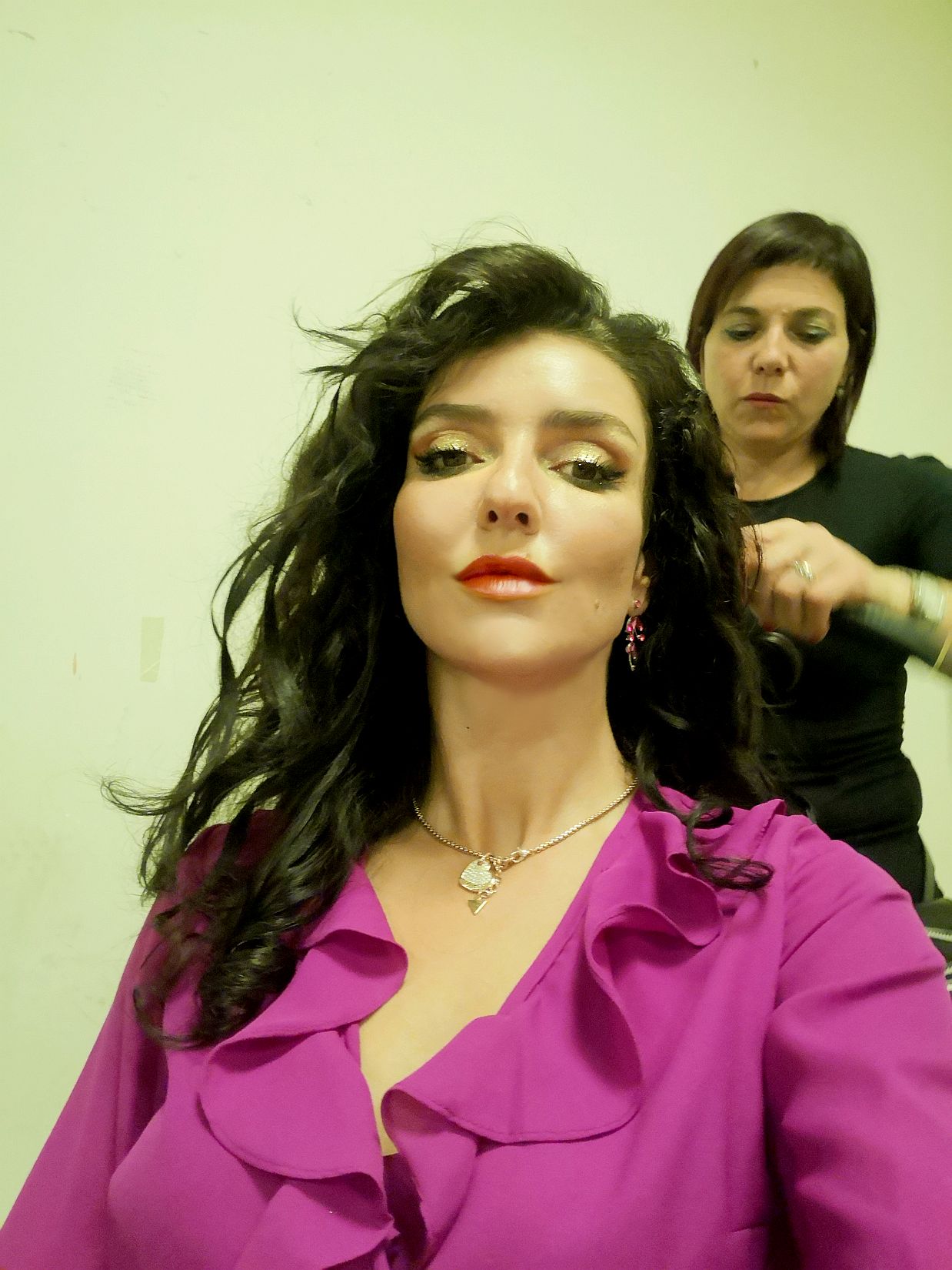 Aj moje vlasy prešli na večerné finále premenou. Z mojich prirodzených kučier, ktoré sa v priebehu poobedia v teple vyformovali spravili pani stylistky elegantnú variantu splývavých vĺn.