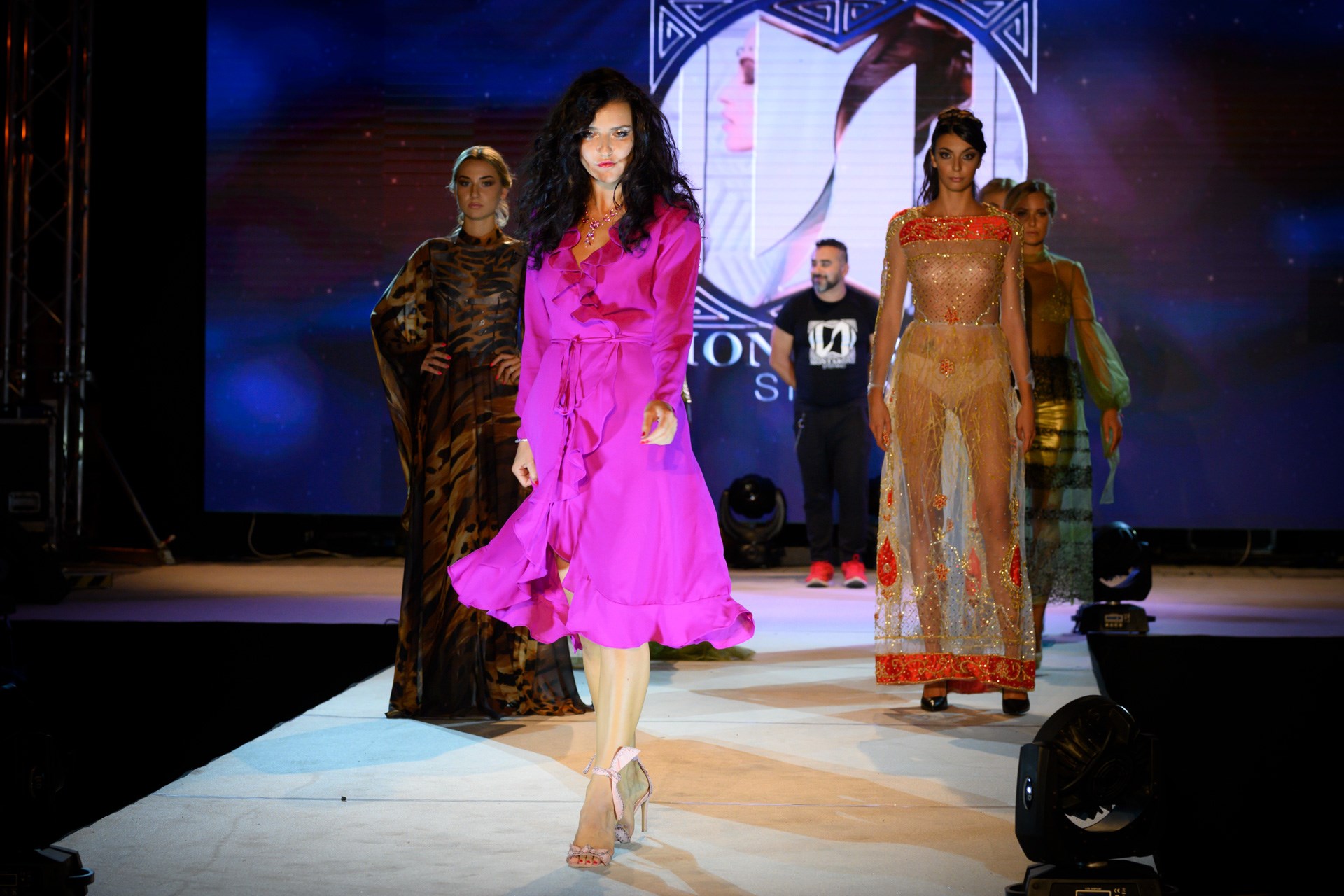 Prehliadku Stefano Montarone som medzi jednotlivými súťažnými kategóriami v závere módneho podujatia ukončila ja, ako medzinárodná modelka v cyklámenových šatách rozvoľneného strihu s volánmi. Potom prebiehali s nami rozhovory a kultúrna vložka oddelila ďalšiu časť.
