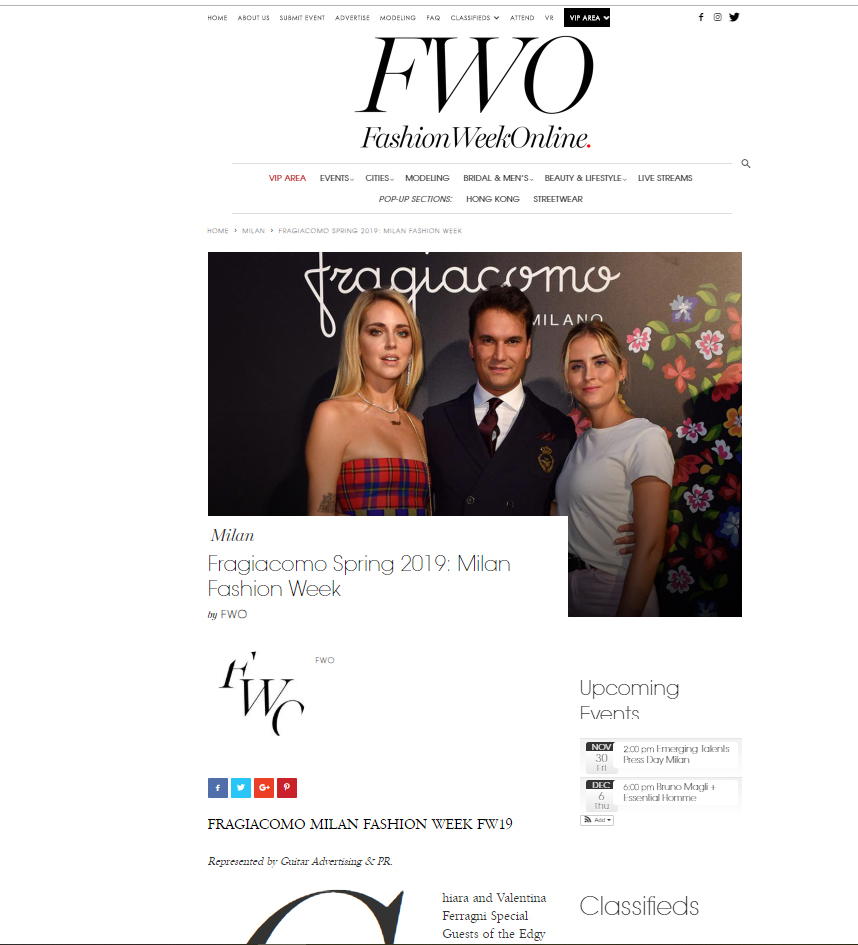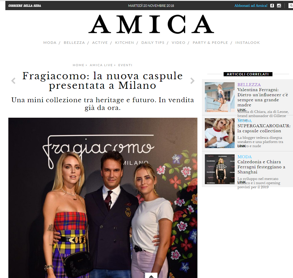 O tejto udalosti písali aj rôzne talianske média ako magazín Amica.it. Link je tu: https://www.amica.it/2018/09/22/fragiacomo-la-nuova-caspule-presentata-milano/?refresh_ce-cp