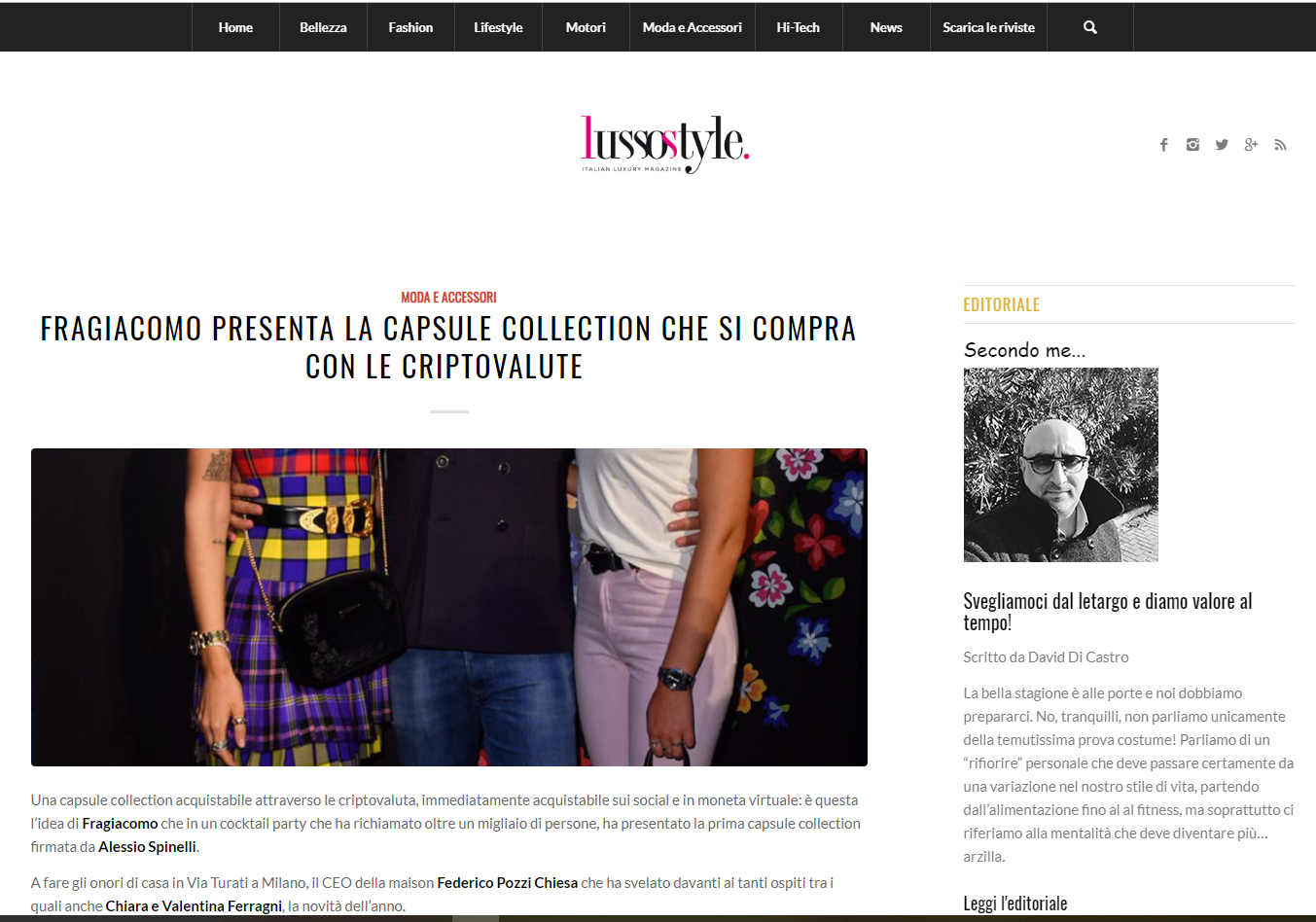 a magazín Lusso Style, link je tu: https://www.lussostyle.it/fragiacomo-presenta-la-capsule-collection-che-si-compra-con-le-criptovalute/