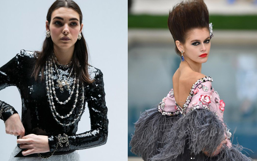 Čo sa týka dizajnu módnych doplnkov, bol Karl Lagerfeld extrémne talentovaný. Vytvoril prehlásený módny kúsok, ktorý sa obliekal s vrstveným perlovým náhrdelníkom. K dramatickým módnym kúskom vyšperkovaným o detail sa radí aj róba modelky Kaia Gerber lemovaná pierkami.