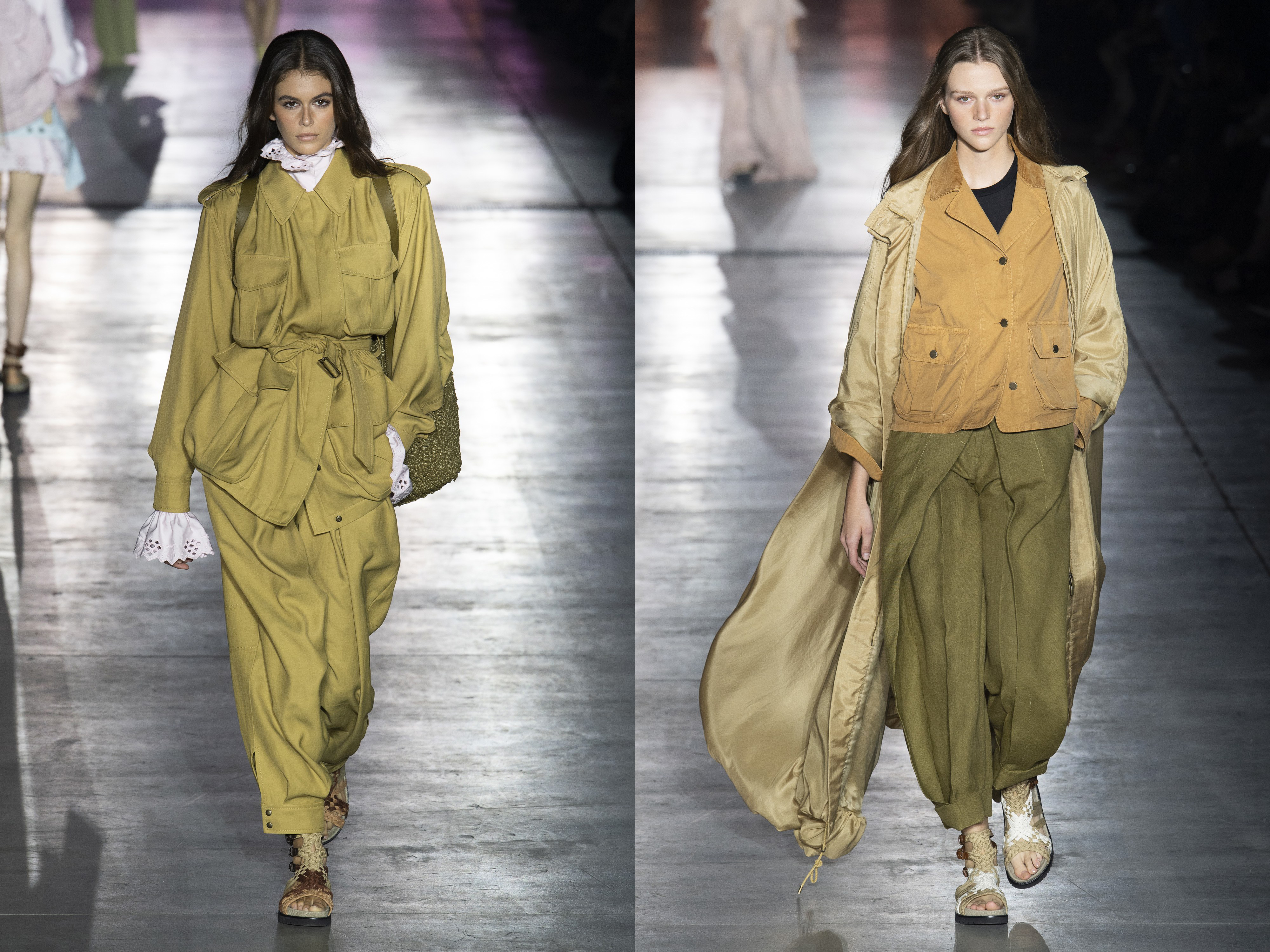 Bezpečnostné pásy sa stali trendy opaskami na prehliadke značky Fendi a boli použité v kombinácii s vyhľadávanými kargo nohavicami farby kamel spolu s okuliarmi na letecký štýl.