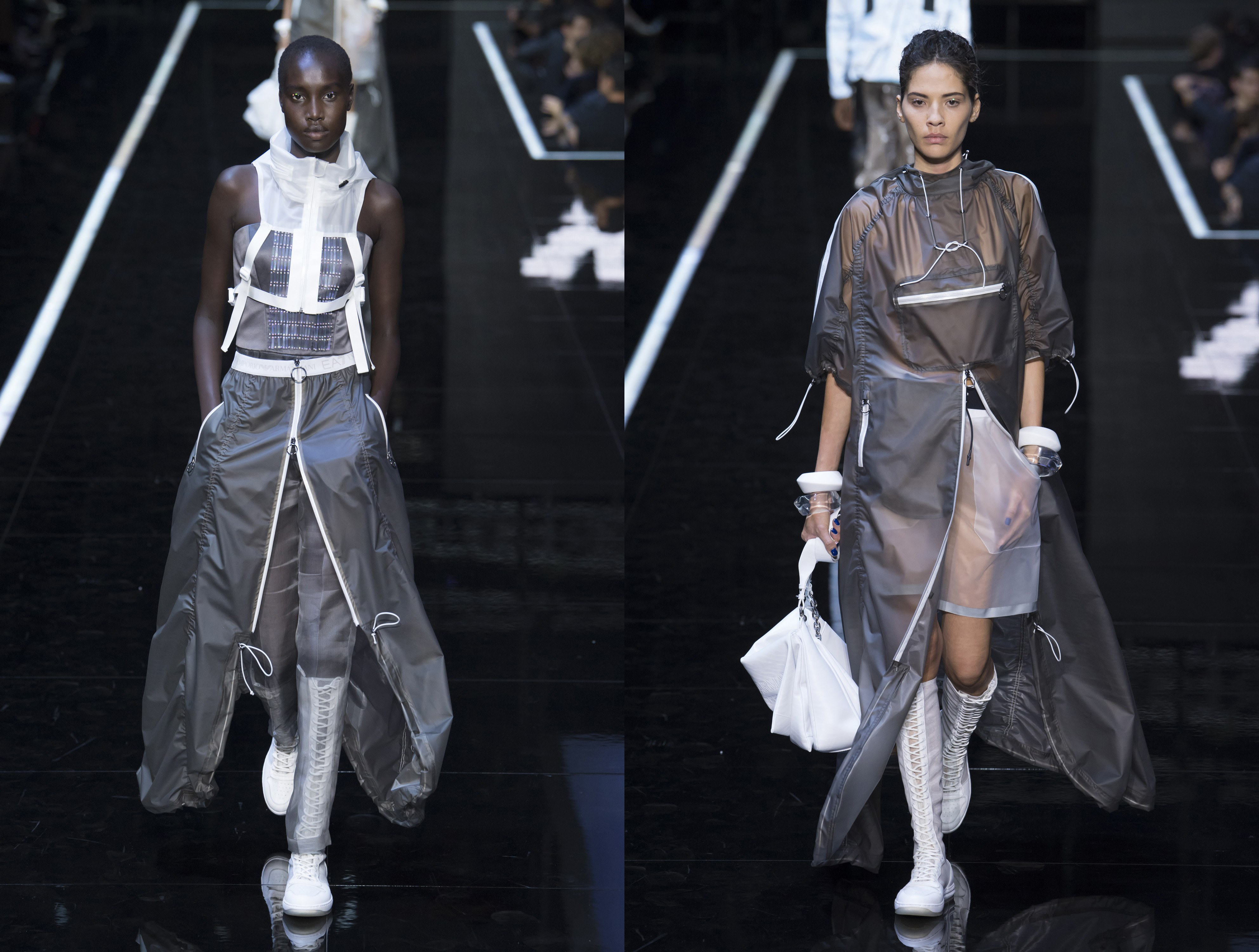 Kráľ Giorgio Armani nechal poletovať kreácie v textilných syntetických vláknach potlačené značkou Emporio Armani na letisku Milano Linate . Predovšetkým technické vetrovky, ale tiež batohy, plecniaky a tenisky sa znovu budú nosiť s reflexnými a vodeodolnými detailami.