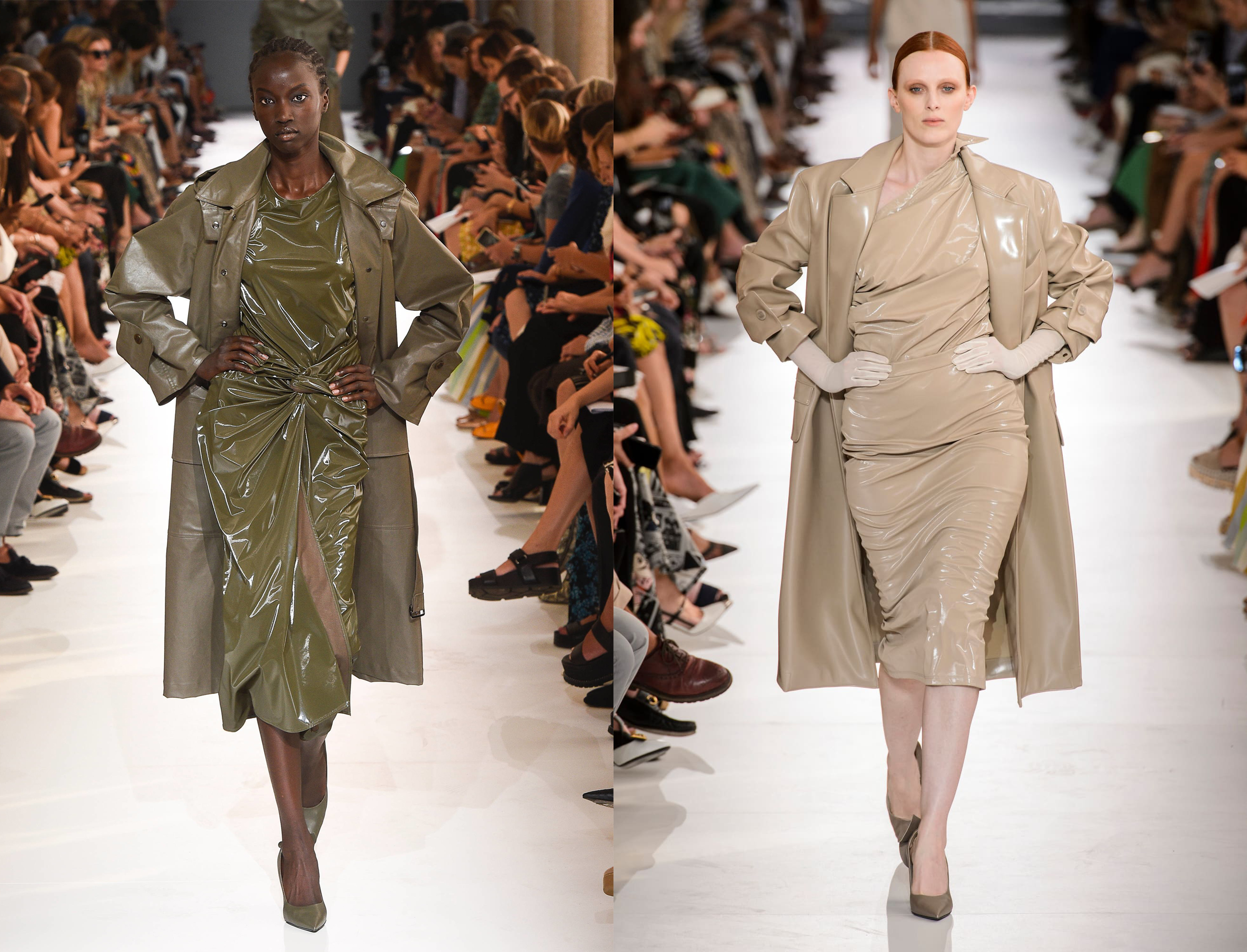 Plastické lakované materiály sú opäť po februárovom Milan Fashion Weeku trendy. Potom, čo značka Marni predviedla lakovaný modrý kabát, módne značky pokračovali v rôznych verziách plastových modelov. Vo farbe kaki a béžovej predviedla značka Max Mara lakovaný odev v jednotnej farebnosti.