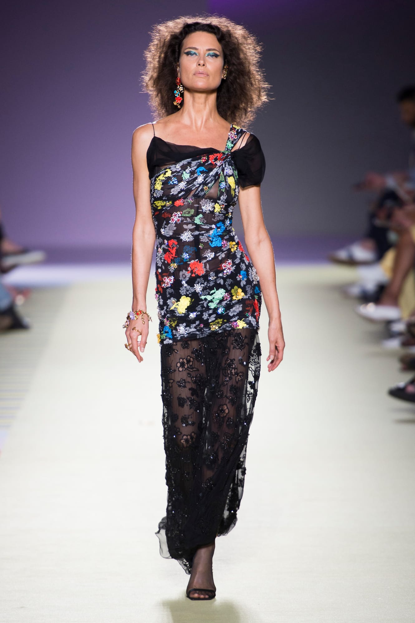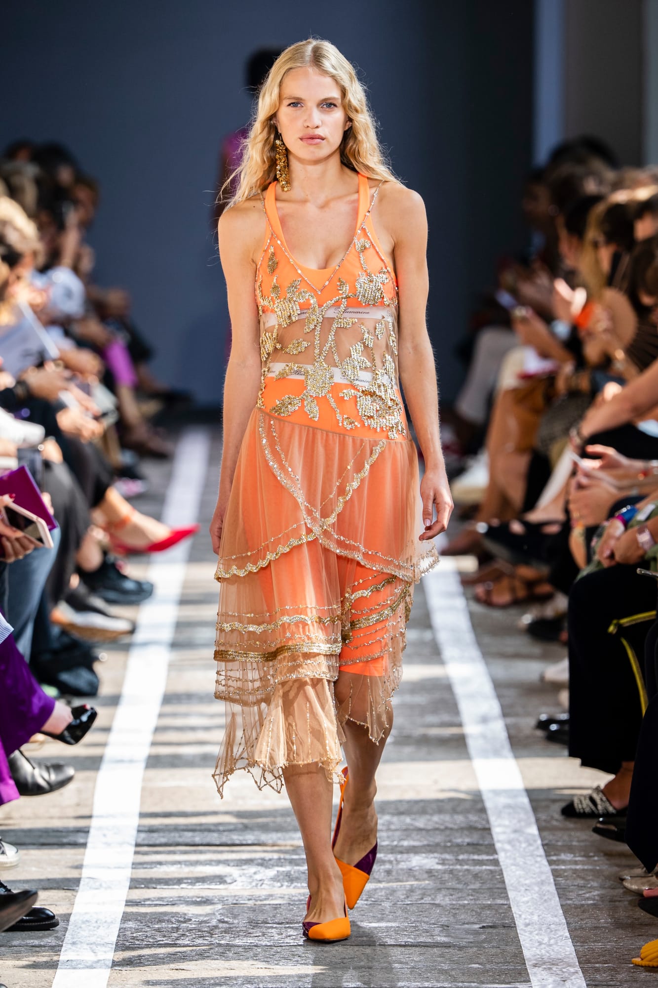 Značka Blumarine vyšla na mólo s orientom a oranžovými šatami so zlatými výšivkami a športovou podprsenkou – žiarivá svieža kolekcia.