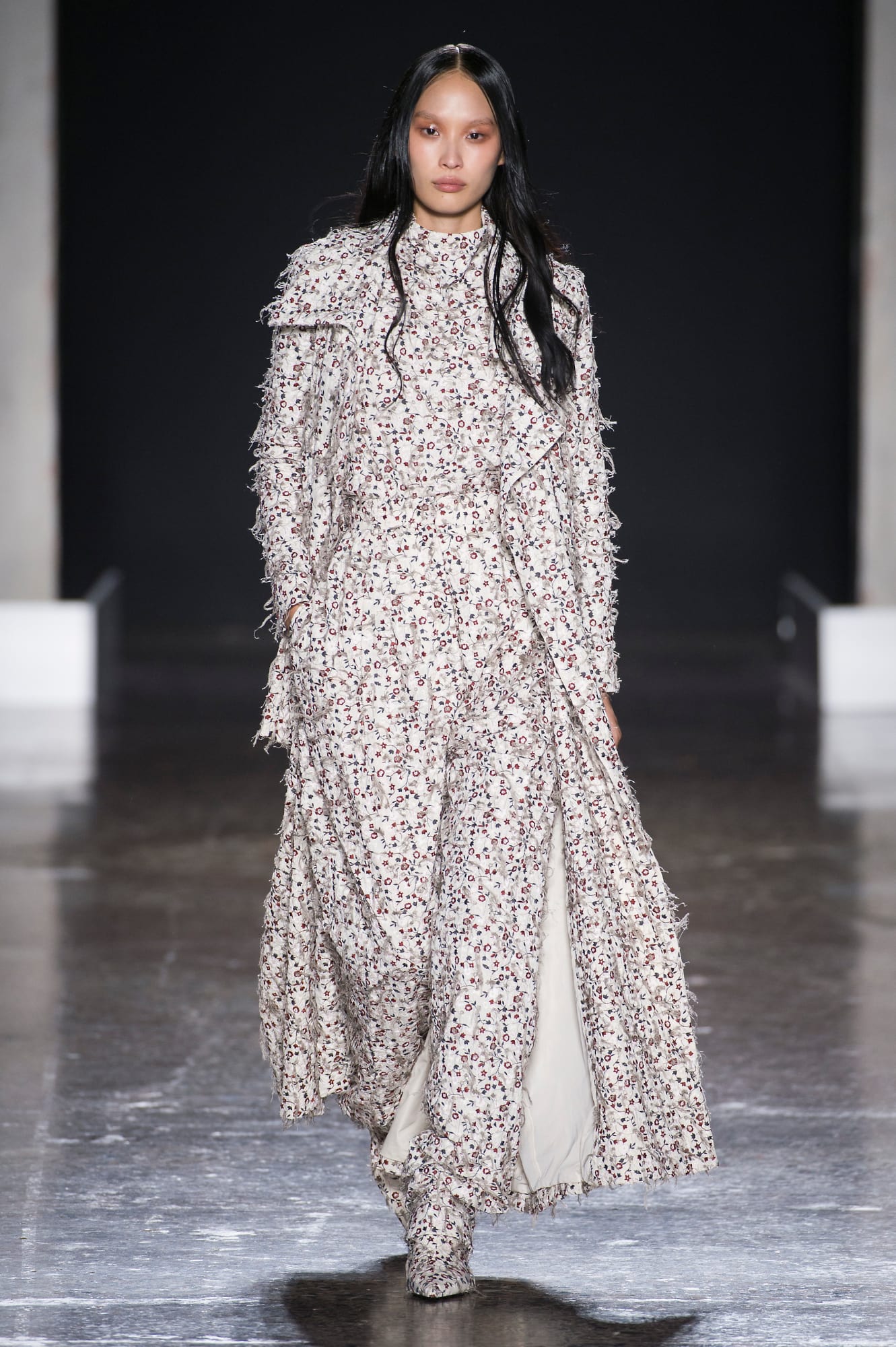 Bohato vyšívané šaty – nohavice top a plášť spojený s topánkami, všetko v jednotnom dizajne, predviedla značka Calcaterra.