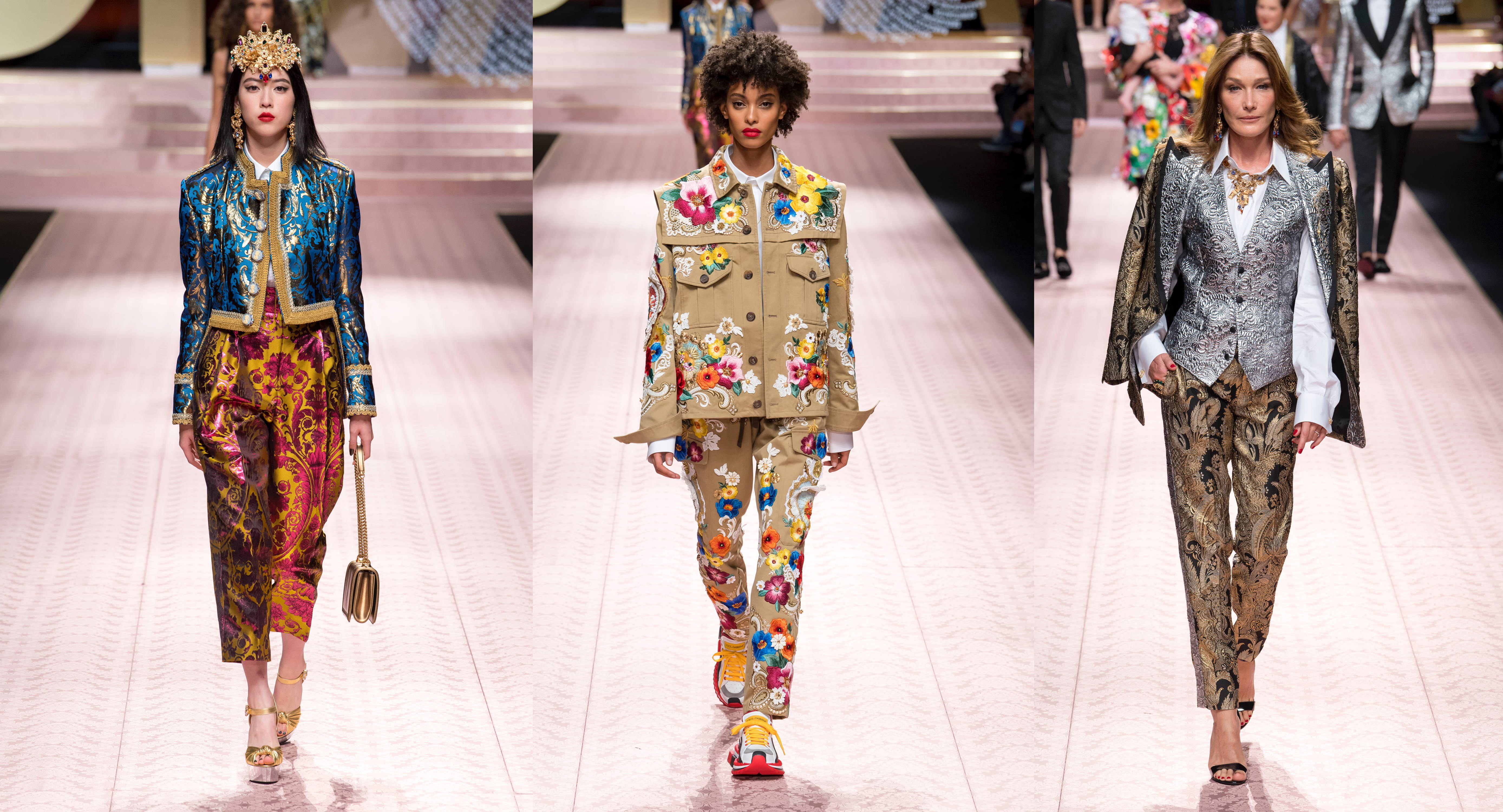 Značka Dolce and Gabbana predvádza svoj typický oslňujúci štýl žiariaci priehrštím farieb, zlata, striebra, honosného brokátu, bohatých výšiviek, čipiek a vzájomných kombinácií. Na móle sa blysla aj päťdesiatnička, bývalá top modelka z 90. rokov a dnes mature modelka Carla Bruni (vpravo) a taktiež talianska diva, herečka Monica Bellucci.