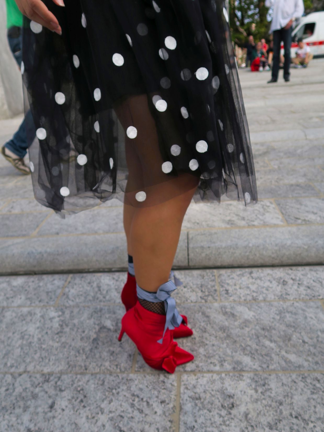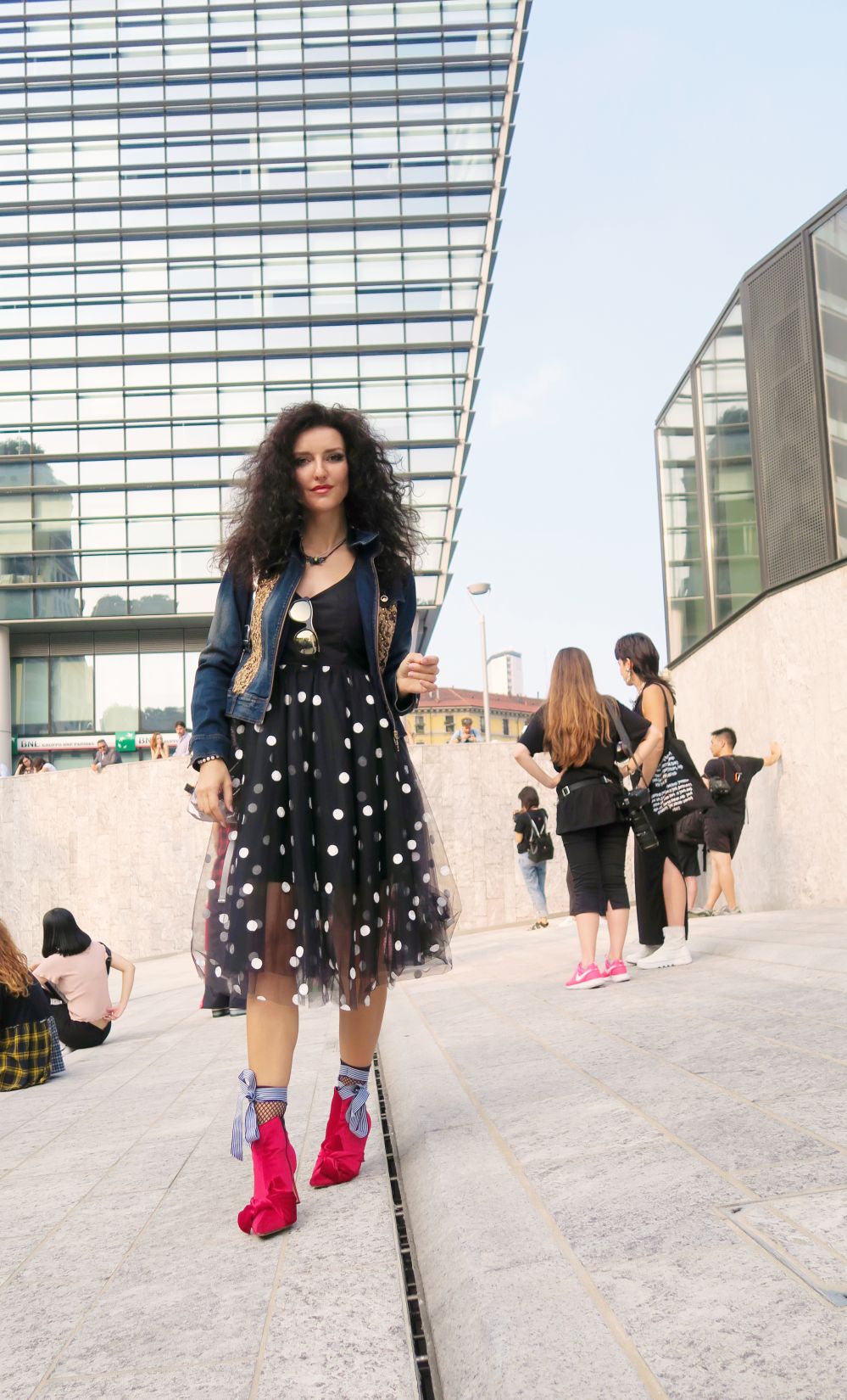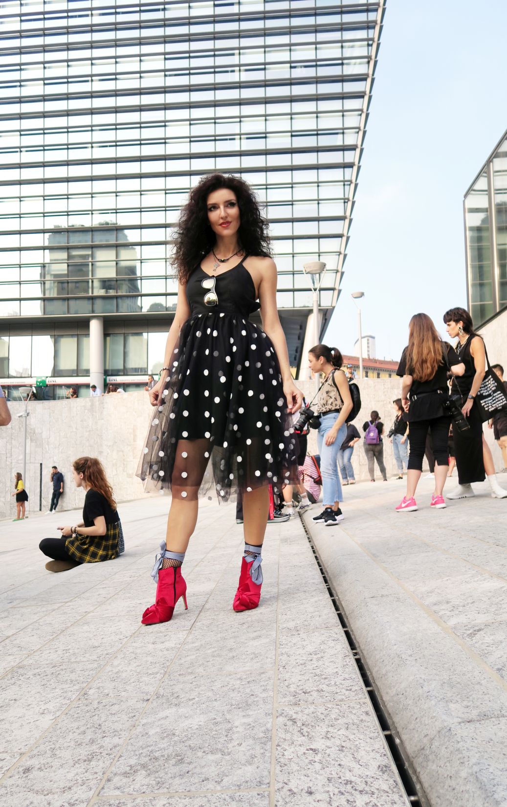 Môj outfit pre prvú polovicu dňa počas Milan Fashion Weeku, 18. september 2018 bol žiarivý zlato-béžový so žltým svietivým crop topom. Niesol sa v elegantnom duchu so sexi nádychom. K tomu looku je aj video, nájdete ho na facebook stránke blogu Mya Mirell Fashionista. Pre druhú polovicu prehliadkového dňa Milan Fashion Weeku, pre prehliadky značky Alberta Ferretti , Annakiki, No21 a Moncler, som zvolila naopak veselý dievčenský look. Bodkované šaty s nadýchanou sukňou a holým chrbátom som pôvodne zamýšlala doplniť sieťovanými pančuškami s bodkami a vzadu s pásikom, skutočne zaujímavý dizajn, no kvôli extrémne horúcemu počasiu, ktoré aj v poobedňajších hodinách bolo okolo 30 stupňov a pri všetkej tej hektike, som zvolila iba krátke sieťované ponožky so zaujímavým šnurovaním. Videá so celebritami – modelkami Gigi a Bellou Hadid, Kendall Jenner, talianskymi sestrami, celebritami Chiarou a Valentinou Ferragni, Oliviou Palermo a inými, si môžete pozrieť na facebook stránke blogu s názvom Mya Mirell Fashionista.