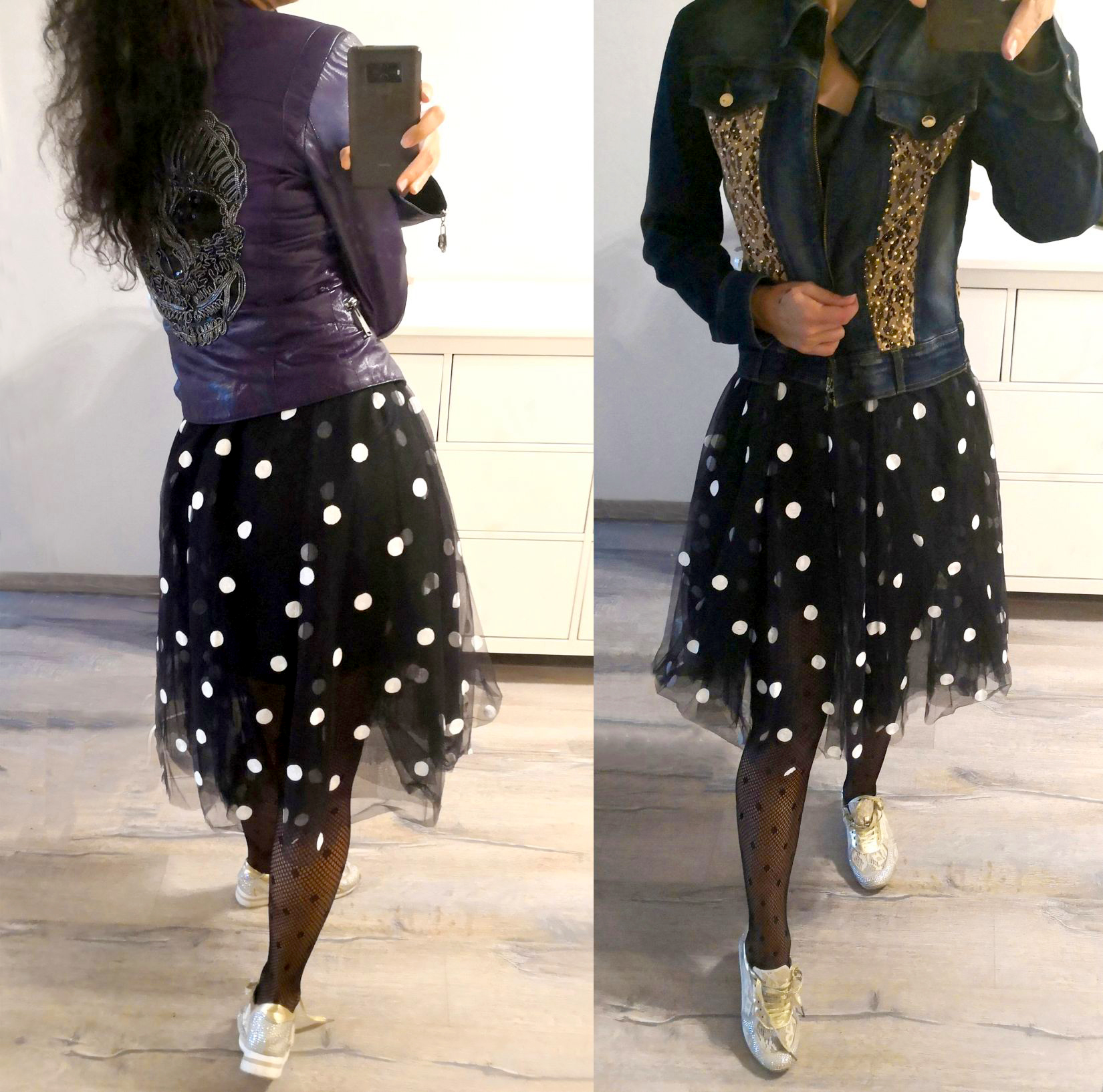 Topánky som mala zvolené vo variantoch, no tenisky na chodenie som prezula po dorazení do cieľa za tieto červené čižmičky a športovú fialovú koženú bundu značky Philipp Plein s flitrovanou kostrou na zadnej časti, som vymenila za ľahkú riflovú bundu so zlatou čipkou značky Versace, ktorá sa mi hodila naopak k tým zlatým čipkovaným teniskám. Tento look som si teda vyskladala hneď niekoľkých variantoch.