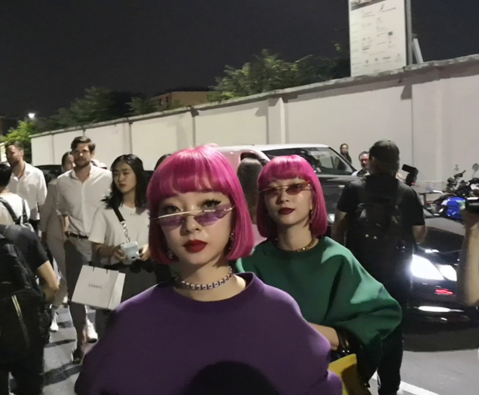 Japonské modelky, DJ-ky, influencerky z Tokia – Ayaxxa Miaya a Amixxa Miaya, dvojičky som stretla okrem prehliadky značky Fendi aj na prehliadke značky Moncler. Stali sa tvárou kolekcie aj značky Moschino návrhára Jeremy Scotta.