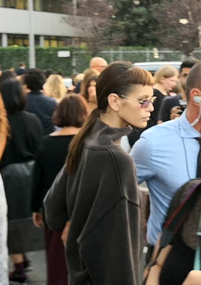 Modelka Bella Hadid vyšla z backstage po prehliadke značky Alberta Ferretti v úspornom tričku bez podprsenky. V skutočnosti je ešte viac chudá ako na fotografiách, keďže optika fotoaparátov pridáva kilá a nadšení fanúšici najmä mužského pokolenia išli na modelke oči nechať. Cestu modelkám – v pozadí v modrom saku je Kendall Jenner a na ďalšej fotografii sestra Gigi Hadid – kliesnilo pár bodyguardov.