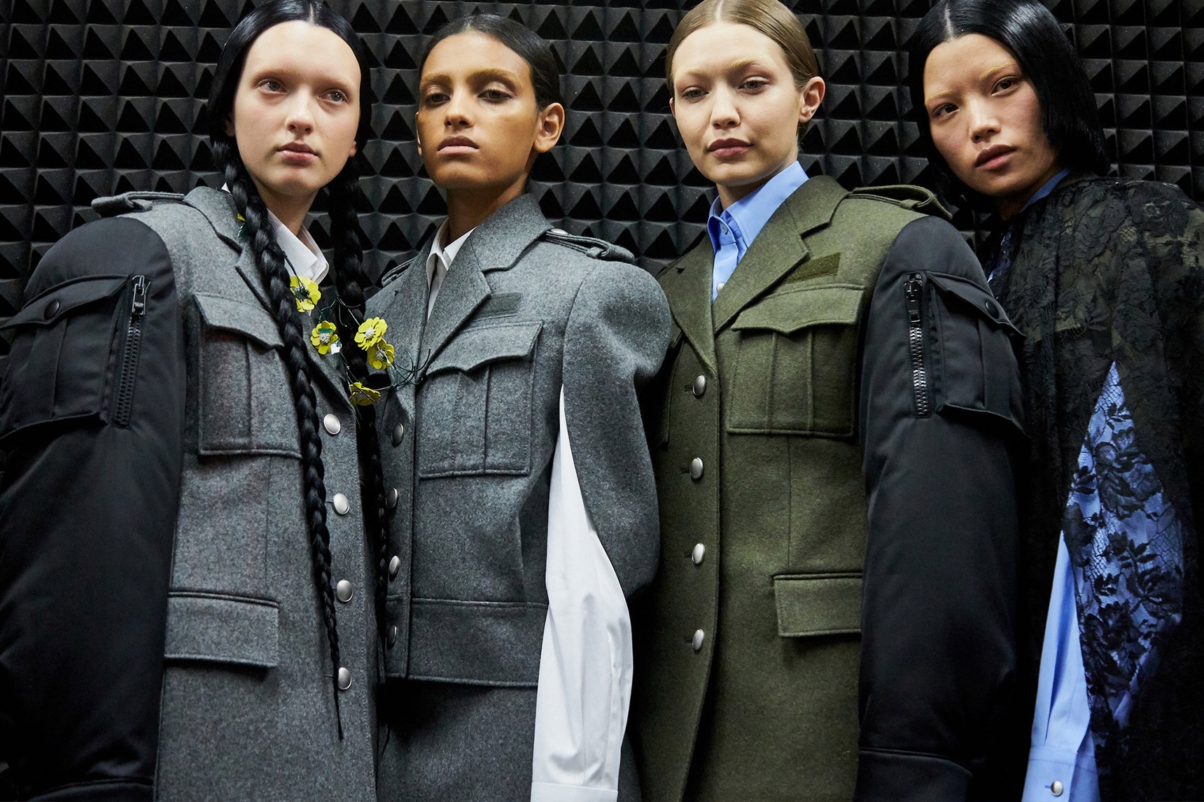 Vojenský look zjemnila farba ako možný variant a aplikácie kvetov na modeloch.