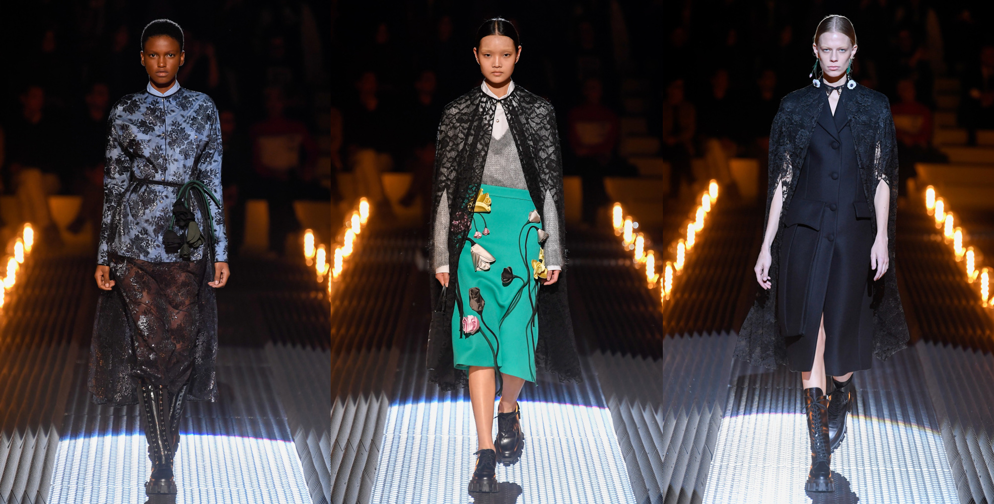 V kombinácii s chunky boots – masívnymi čižmami, tvoria čipkované plášte výrazný protipól.
