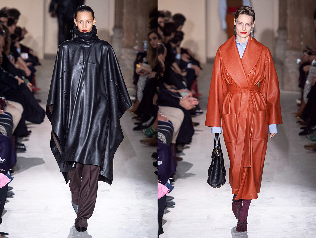 Talianska módna značka Salvatore Ferragamo ostala verná tradičnému materiálu koži a pre túto zimnú sezónu priniesla kožené plášte ale aj ponchá.