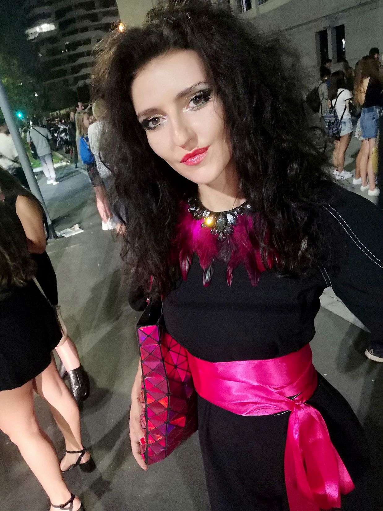 Pre VI. prehliadkový deň módneho maratónu v Miláne som zvolila tieto dievčenské šaty s volánovým lemom v zaujímavej farbe. Šaty sú s dlhým rukávom, veľmi pohodlné, s previazaním v páse v nádhernej sýtej modro-fialovej farbe a vhodné na teplý letný večer, aký v tej deň panoval. Môj silný pocit nechať vyniknúť modro-fialovú farbu kontrastom s fuchsiovou či červenou farbou, mal za výsledok rozžiarenie celého looku. Zaujímavá farebná kombinácia zaujala aj viacerých street style fotografov. Ako kontrast k šatám som teda zvolila červené a fuchsiové doplnky.