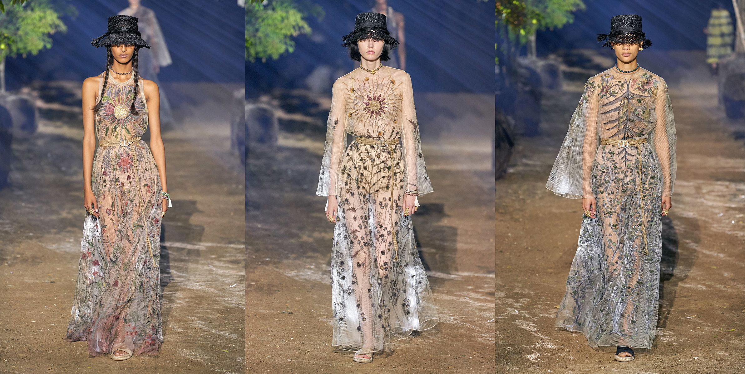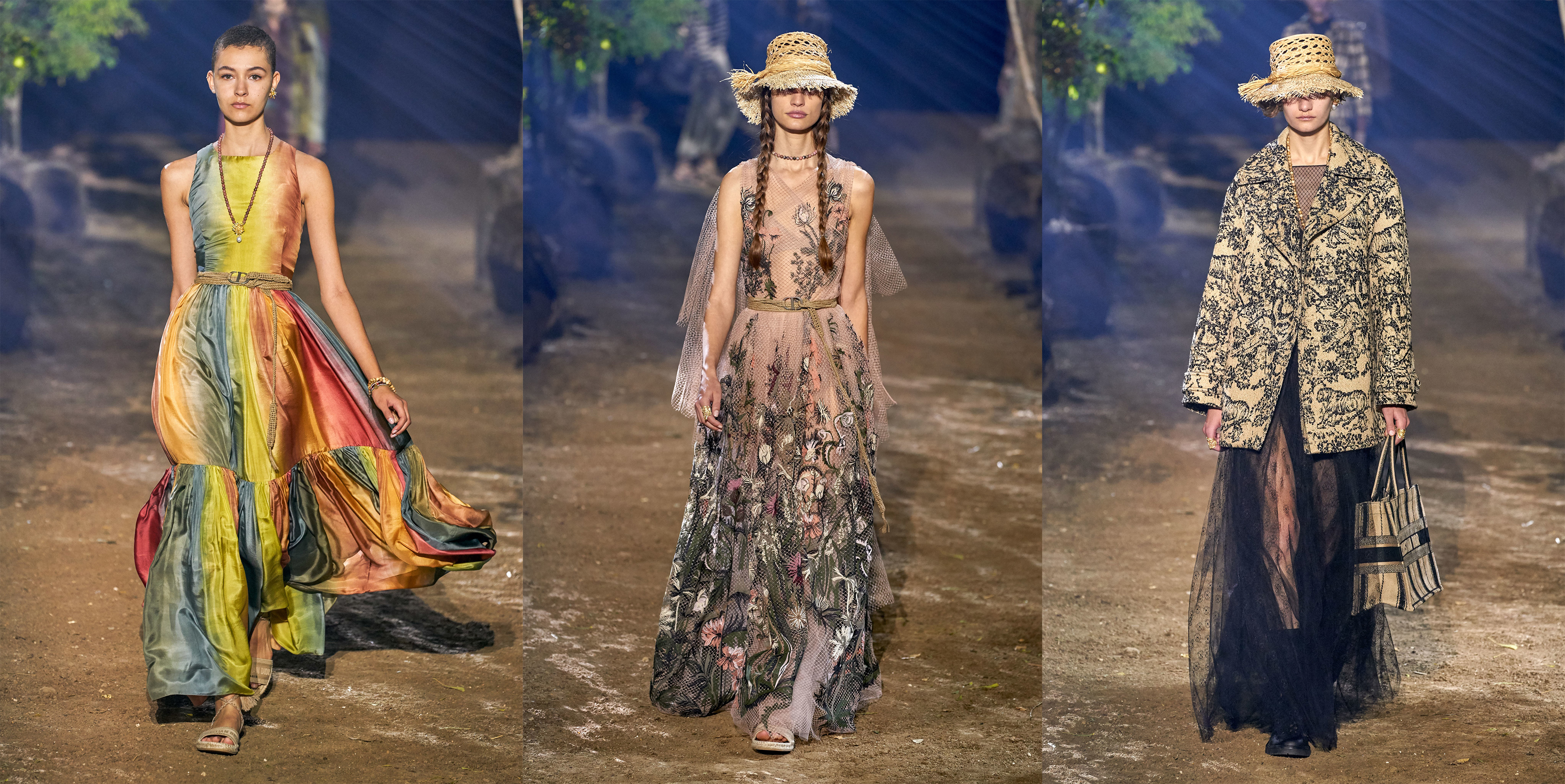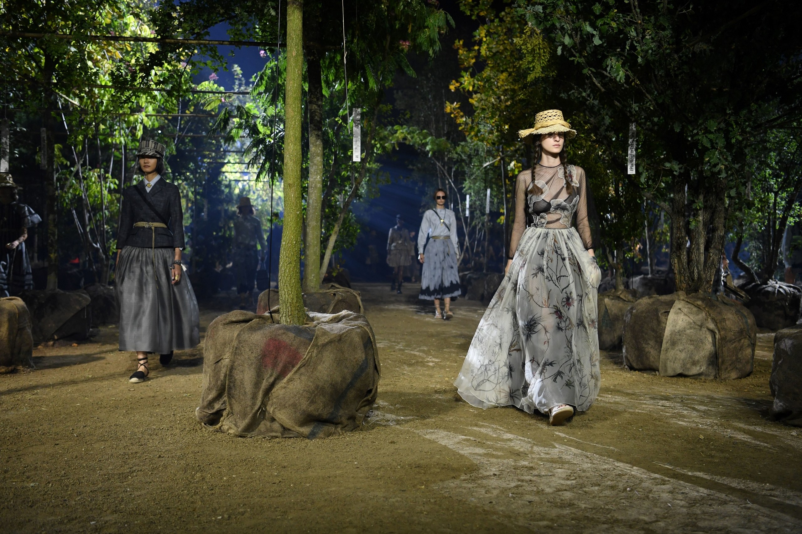 Dior módna show pre sezónu Jar / Leto 2020 bola oslavou prírody, zemská a lesná a niesla sa v duchu vyšívaných motívov vegetácie na šatách a textúrových rafia sukniach k skutočným stromom použitých na setoch.
