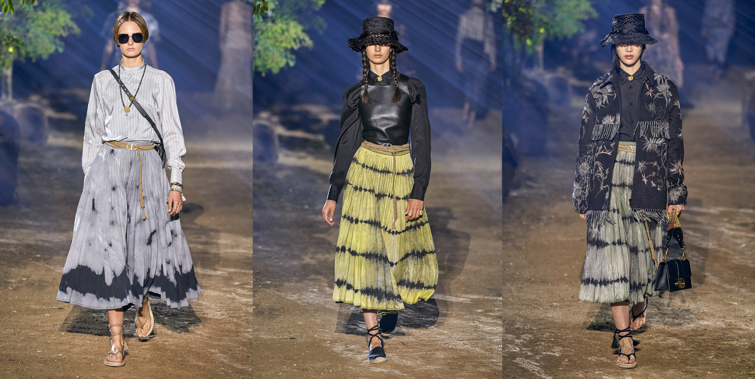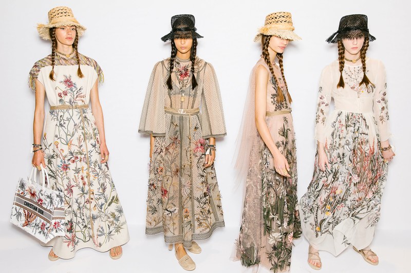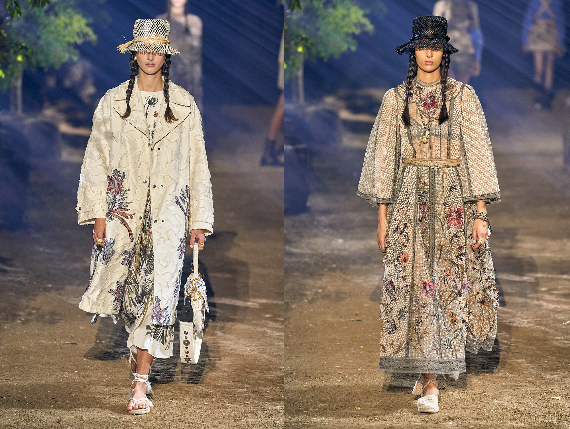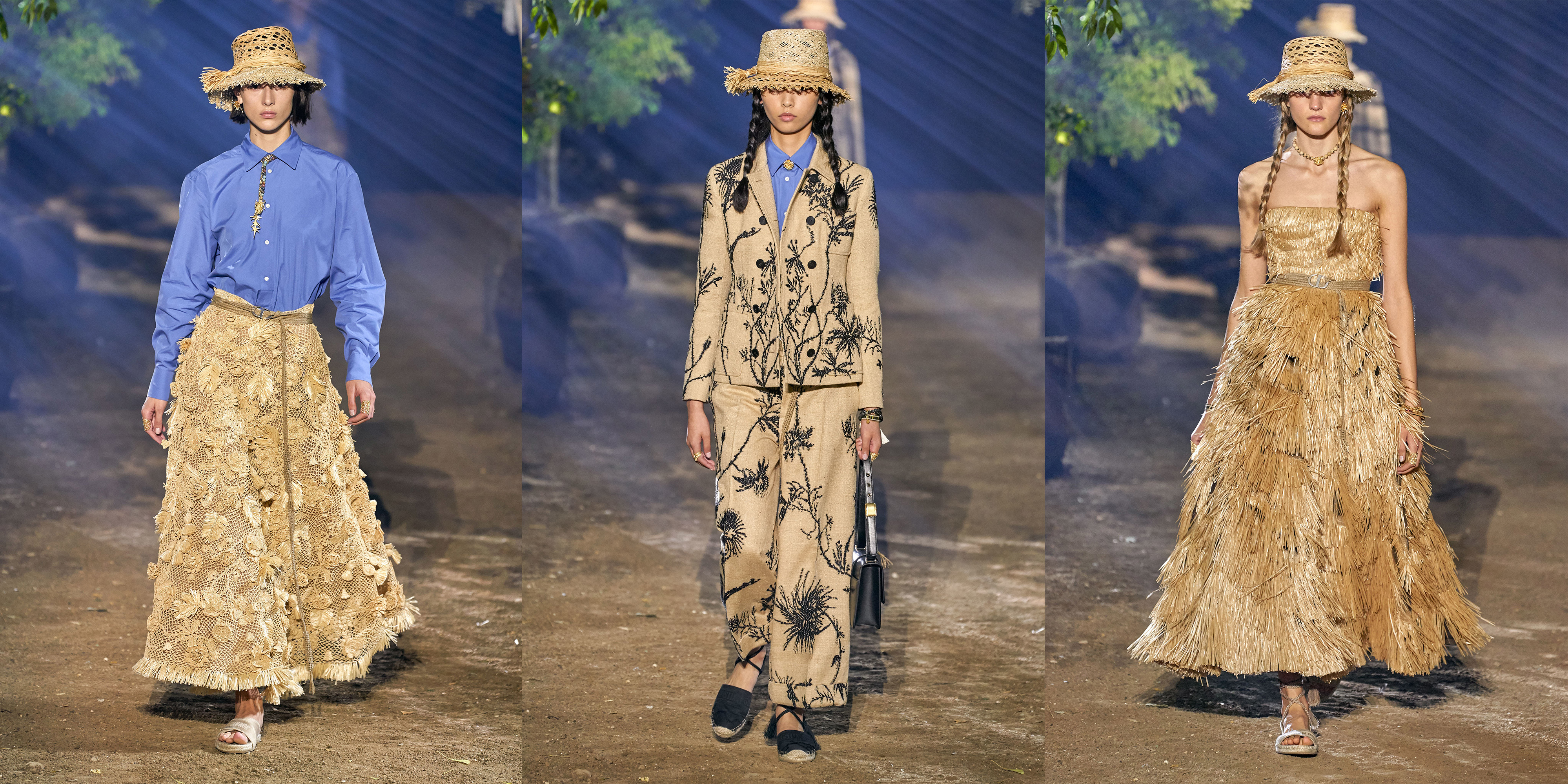 Dior módna show pre sezónu Jar / Leto 2020 bola oslavou prírody, zemská a lesná a niesla sa v duchu vyšívaných motívov vegetácie na šatách a textúrových rafia sukniach k skutočným stromom použitých na setoch.