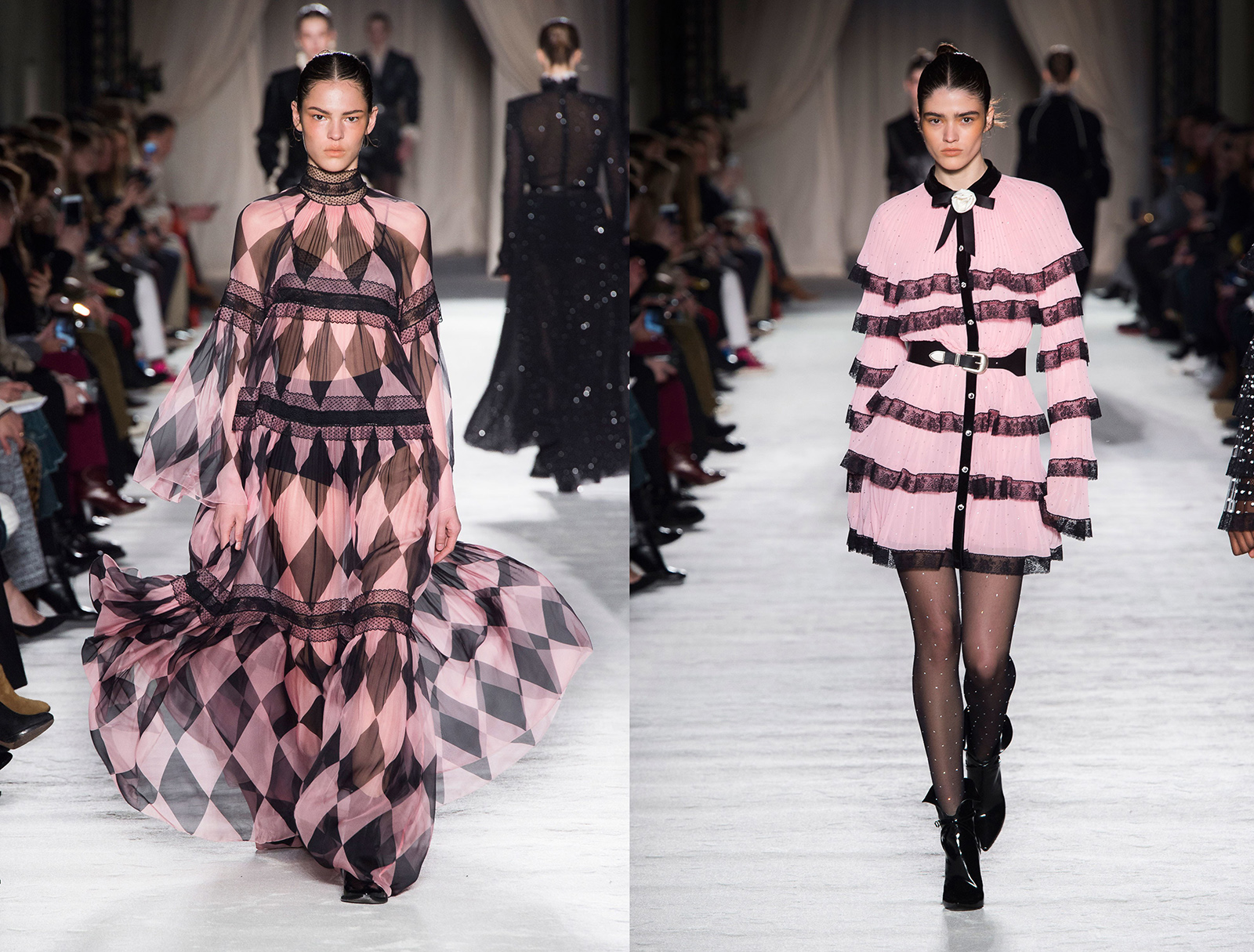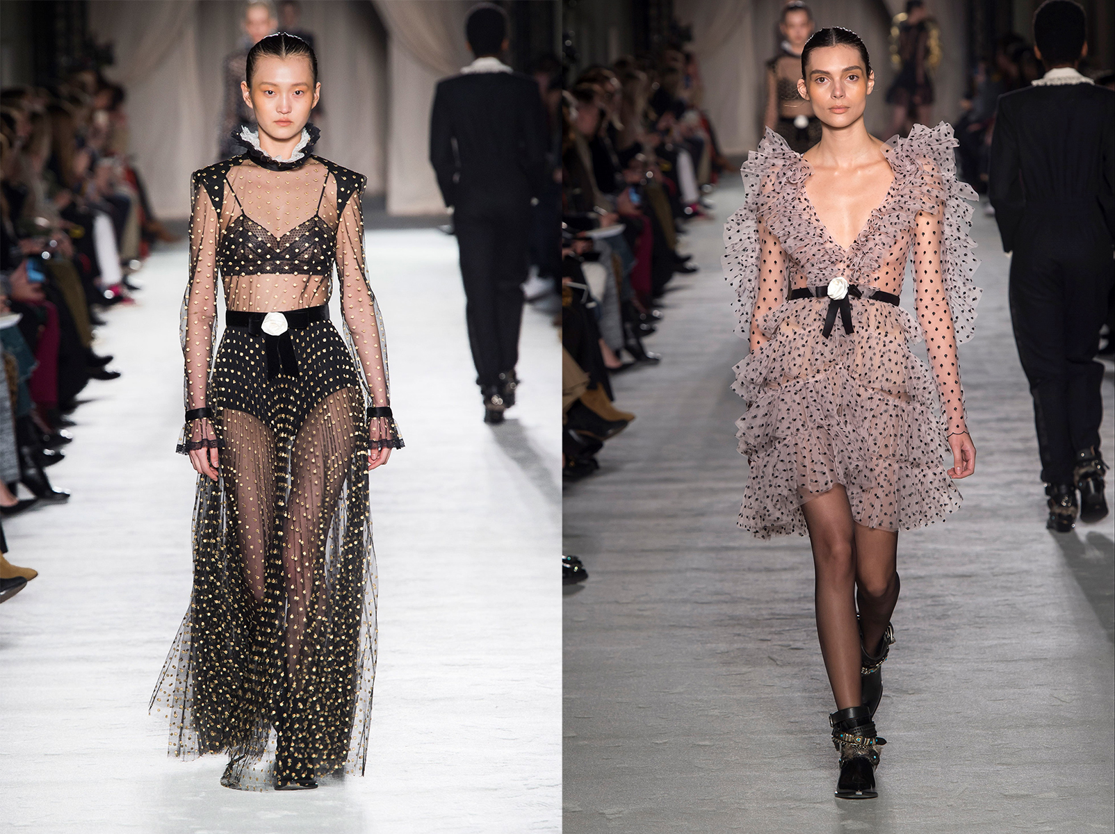 Transparentné materiály, volánové detaily a bodky tvorili romantickú časť kolekcie Lorenzo Serafini – jeseň/zima 2018 – 19.