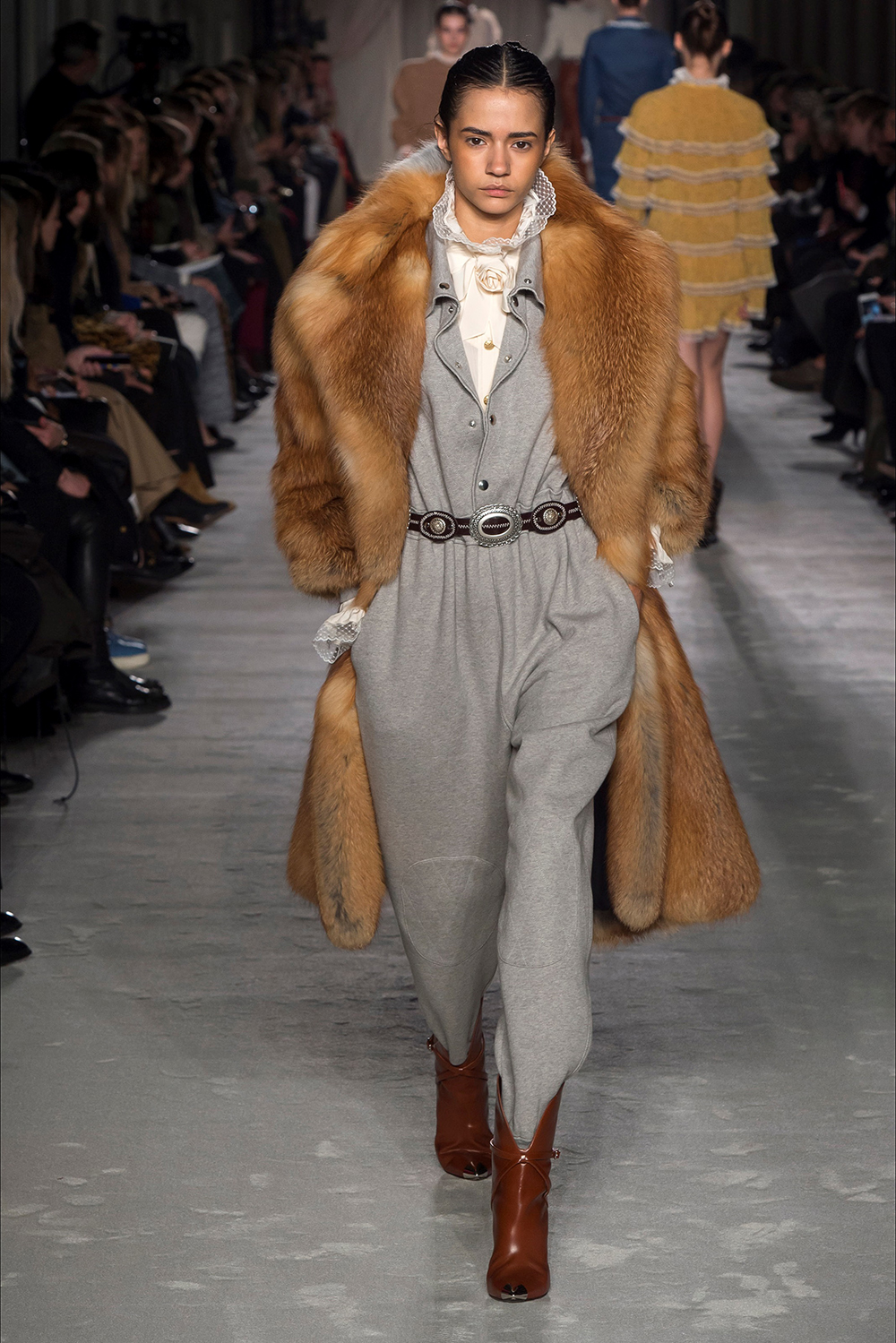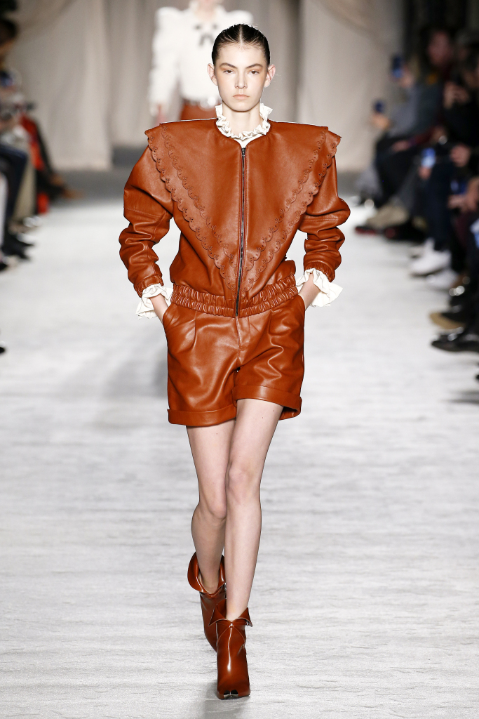 Zvýraznené ramená, stojáčikové volánové goliere, voľné nohavice, to sú prvky 80. rokov v zimnej kolekcii 2018 -19 Lorenzo Serafini doplnené o western prvky – členkové čižmy, kožušiny, strapce, opasky, denim.