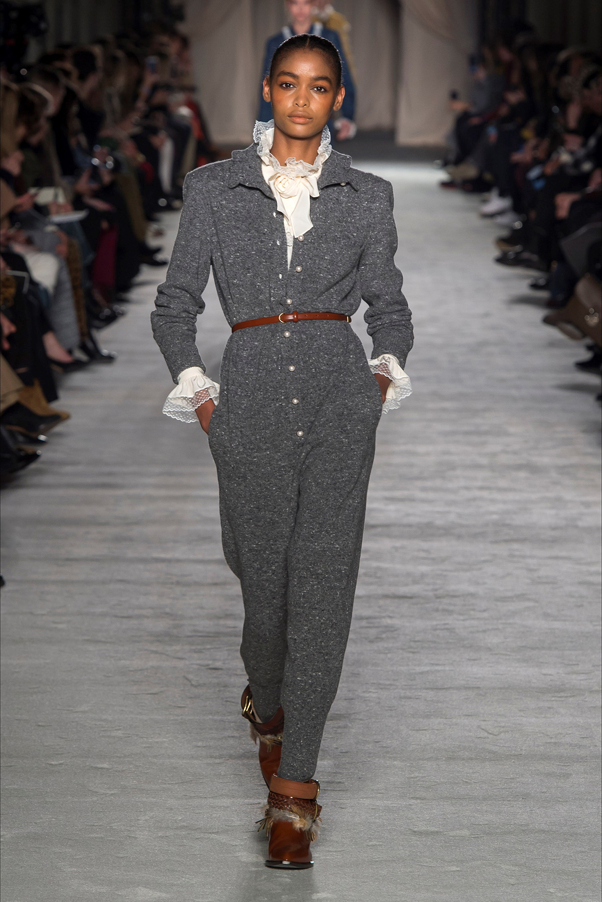 Riflovina v podobe overalov, zdvojená riflovina na modeloch v kombinácii s romantickými prvkami a členkovými čižmami – aj tým je charakteristická zimná kolekcia 2018 -19 talianskeho módne návhrára Lorenzo Serafiny.