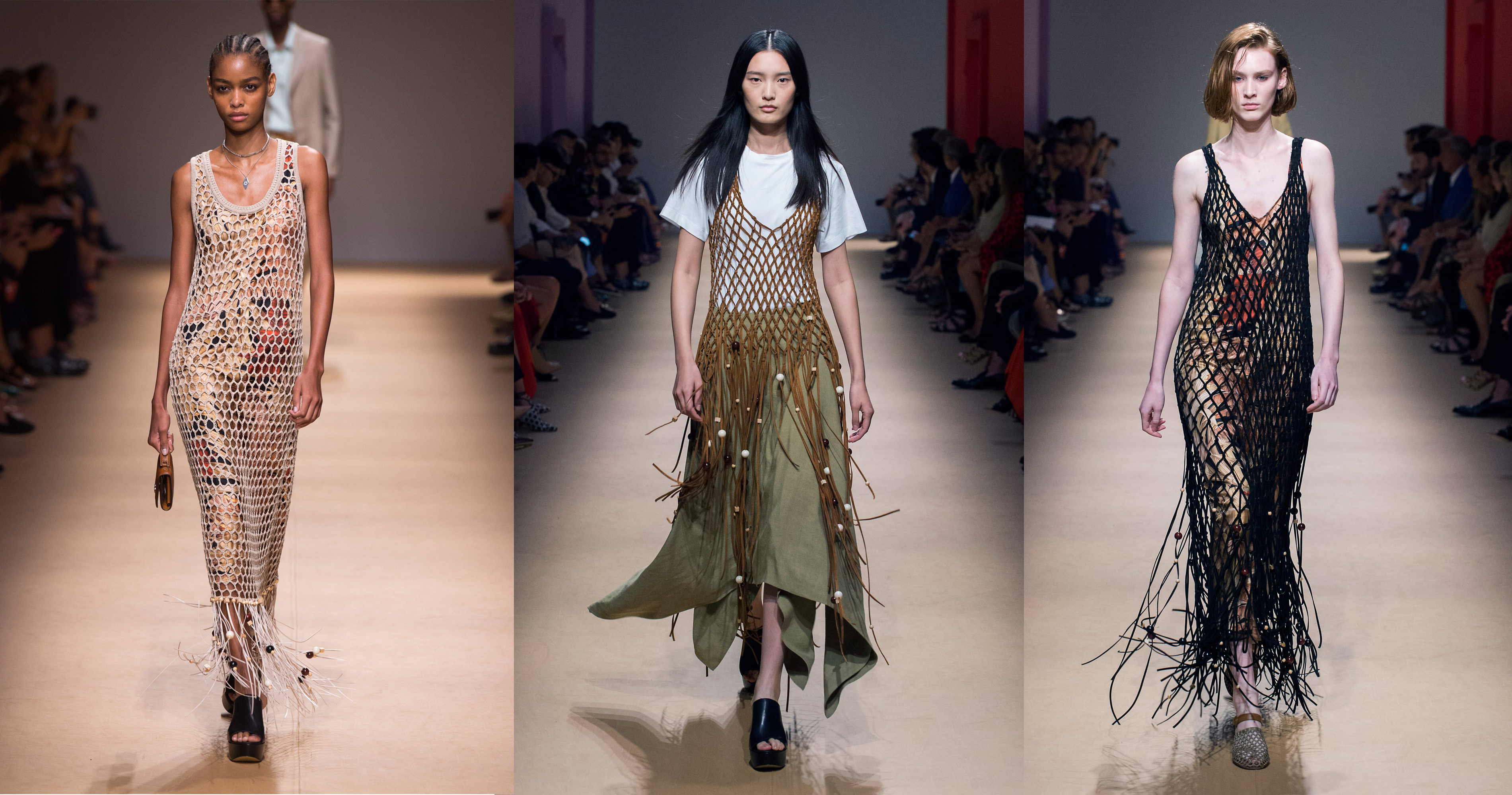Háčkované veľké oká sieťových šiat ako vrchný diel cez tričko alebo navlečené na spodné šaty, sú novými trendami pre nasledujúcu sezónu jar/leto 2019 aj v kolekcii značky Salvatore Ferragamo.