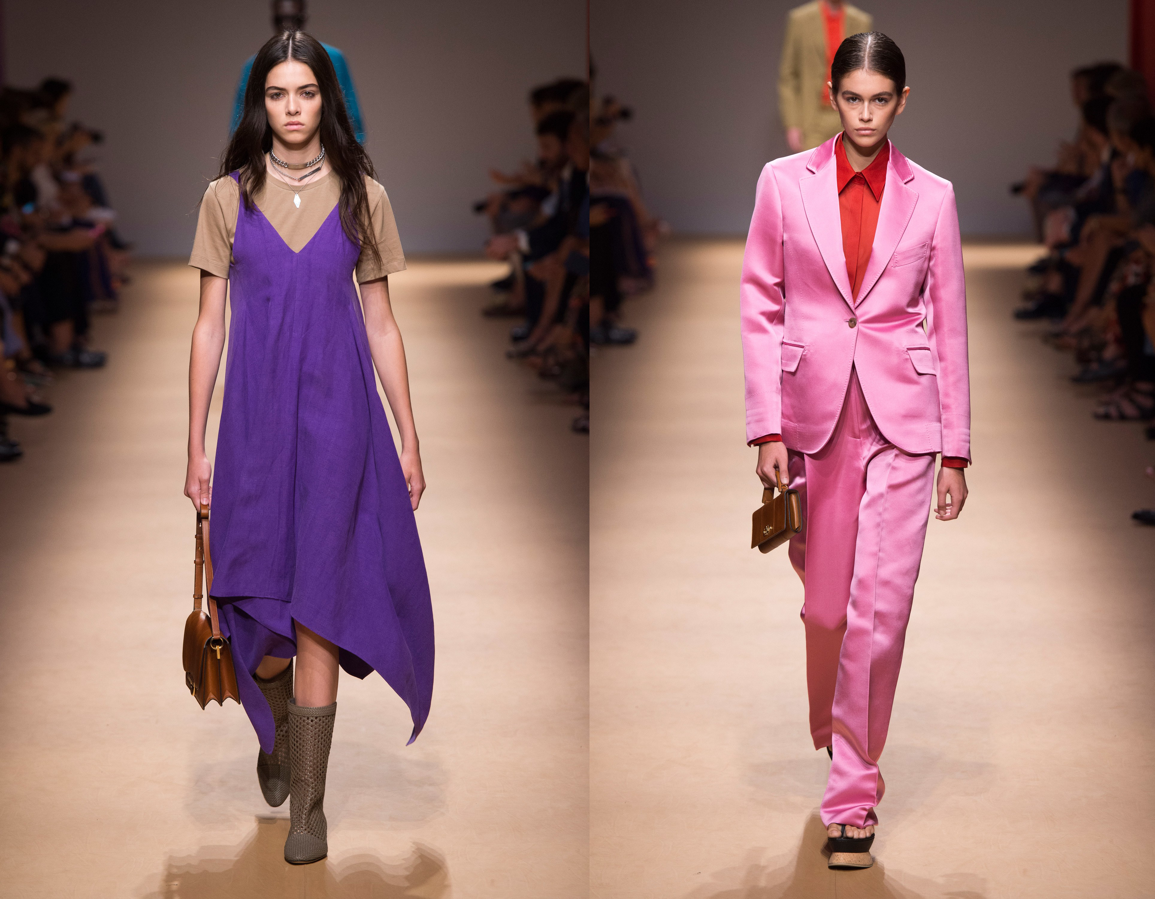 Zaujímavé kúsky kolekcie boli najmä ružový saténový nohavicový kostým predvedený modelkou Kaia Gerber a ultraviolet jednoduché plážové šatyna tričku.