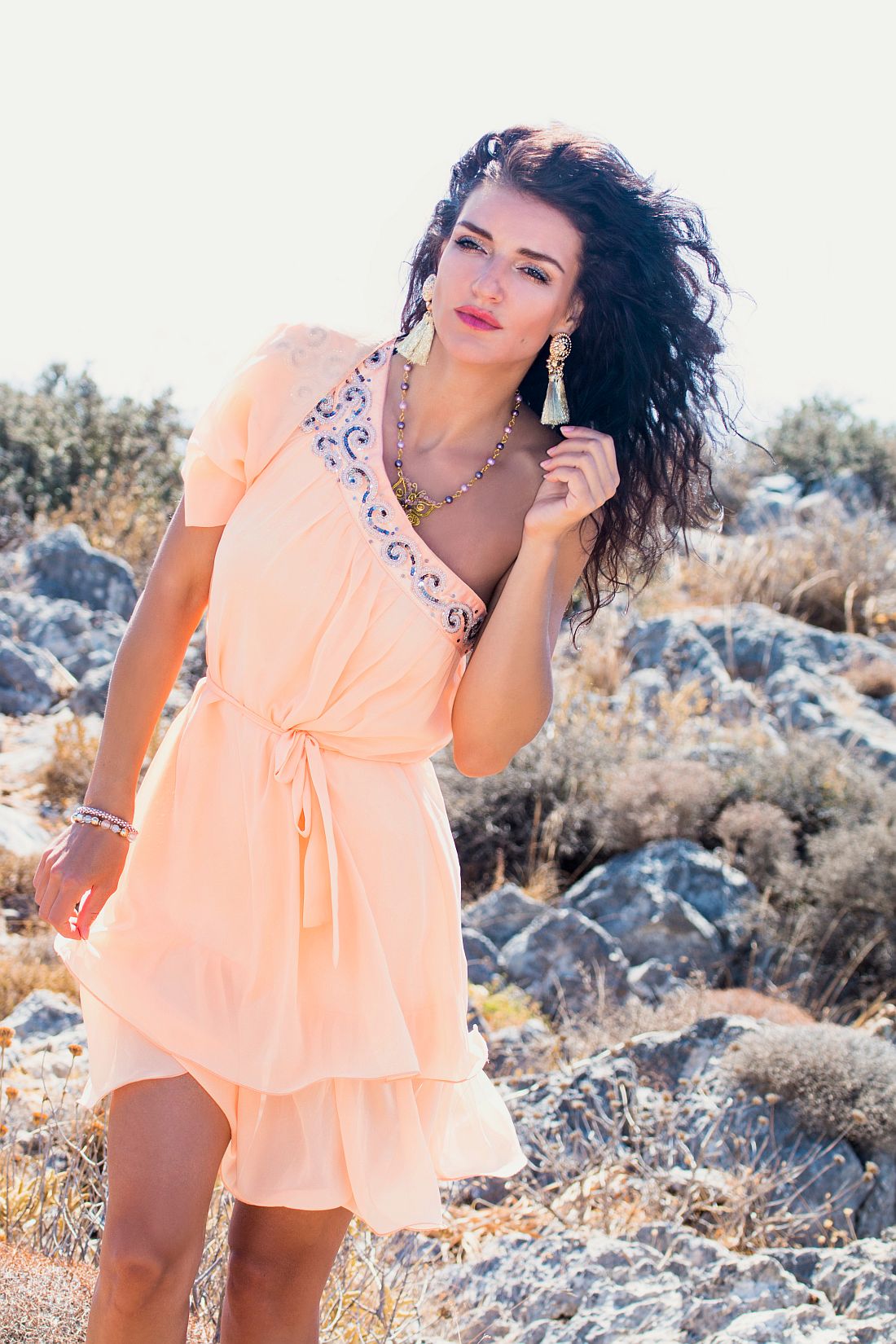 Jemná broskyňová farba na volánových šatách nechá vyniknúť letné opálenie a zlatisto-bronzový make-up. V kontraste s tmavými vlasmi, doplnkami a elegantným beauty lookom, ktorý môžete zvoliť, im dáva pridanú hodnotu luxusného nádychu.